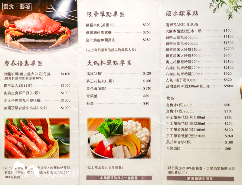 主要菜色:鼎蒸籠蒸鮮龍魚片、萬古燒吟釀珍蟳、岩燒牛小排