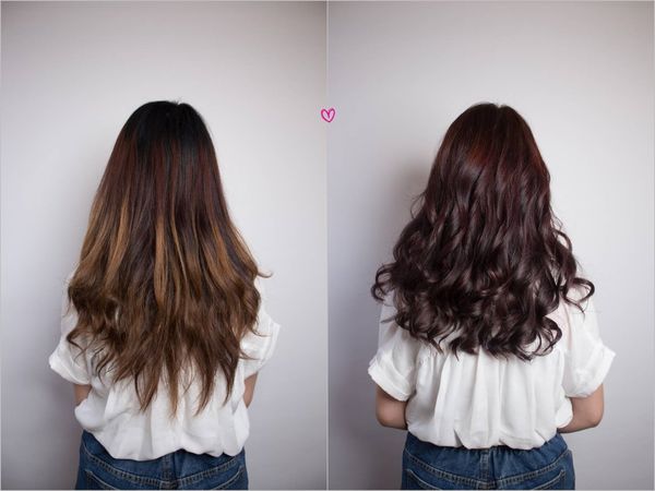 上方用紅粉色調將黑髮蓋過,尾端用紅紫色調和讓髮尾色澤飽滿點,