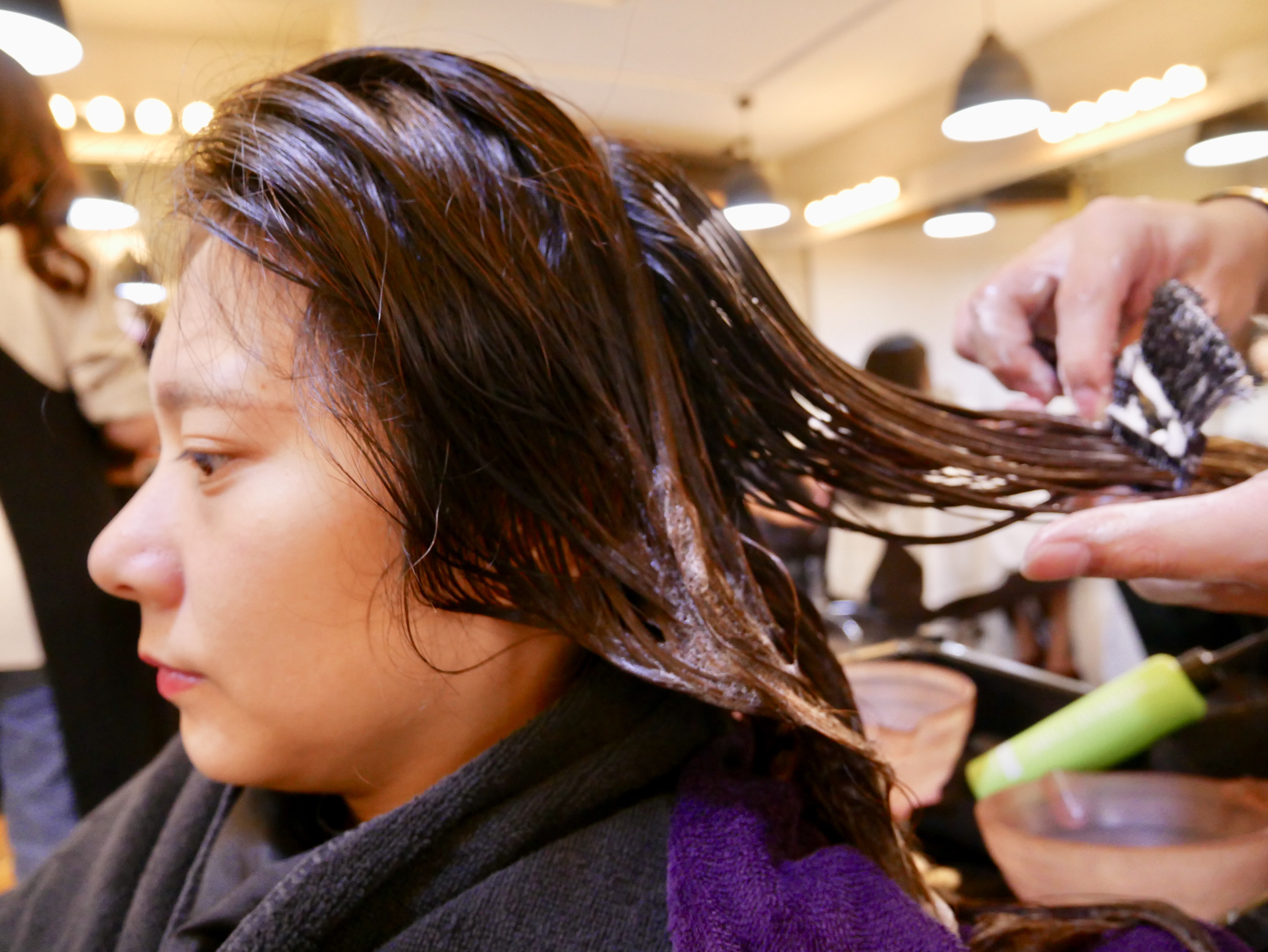 不停的塗抹髮絲 , 幫頭髮做馬殺雞 , 讓護髮素更能滲透好吸收