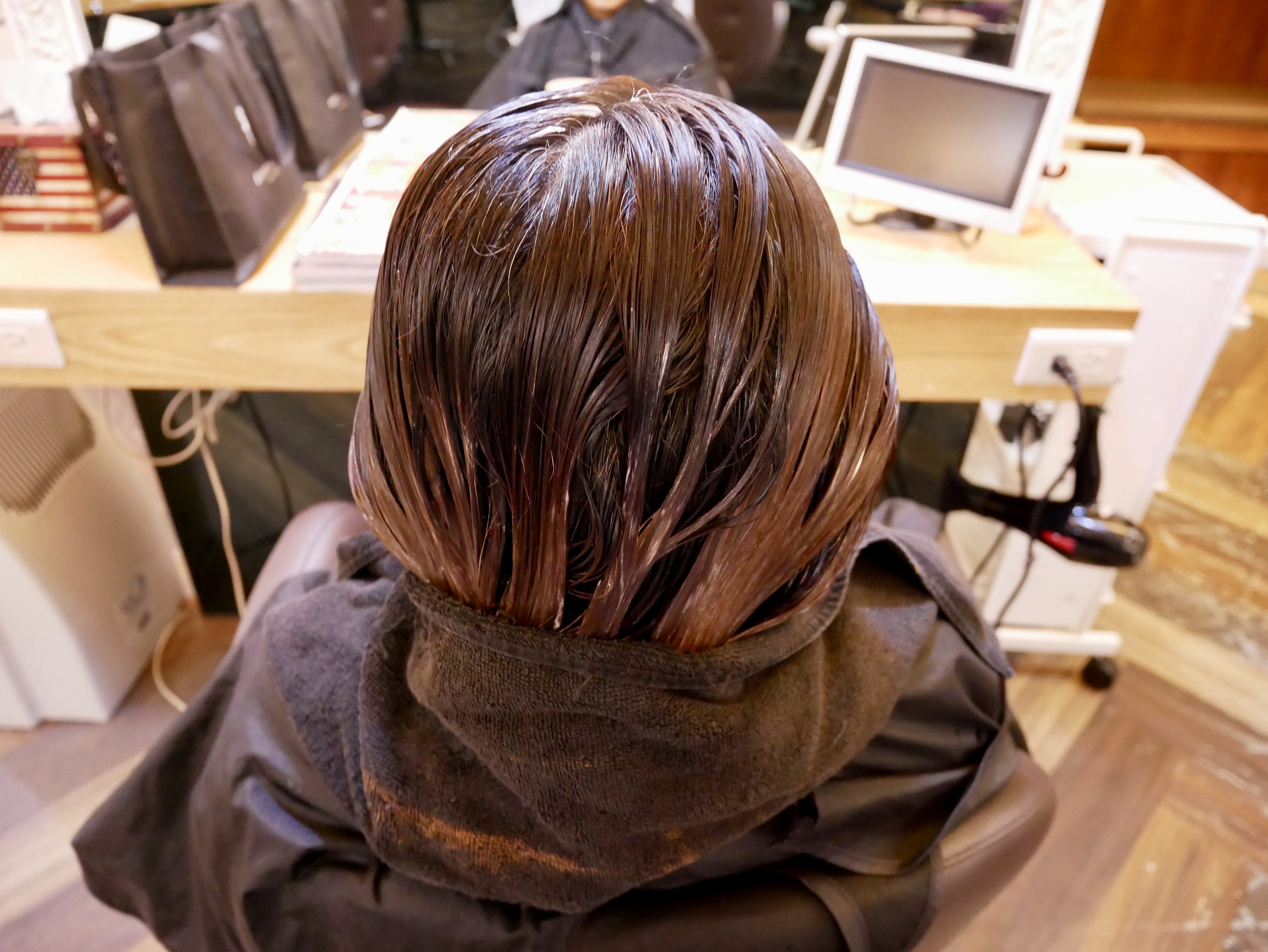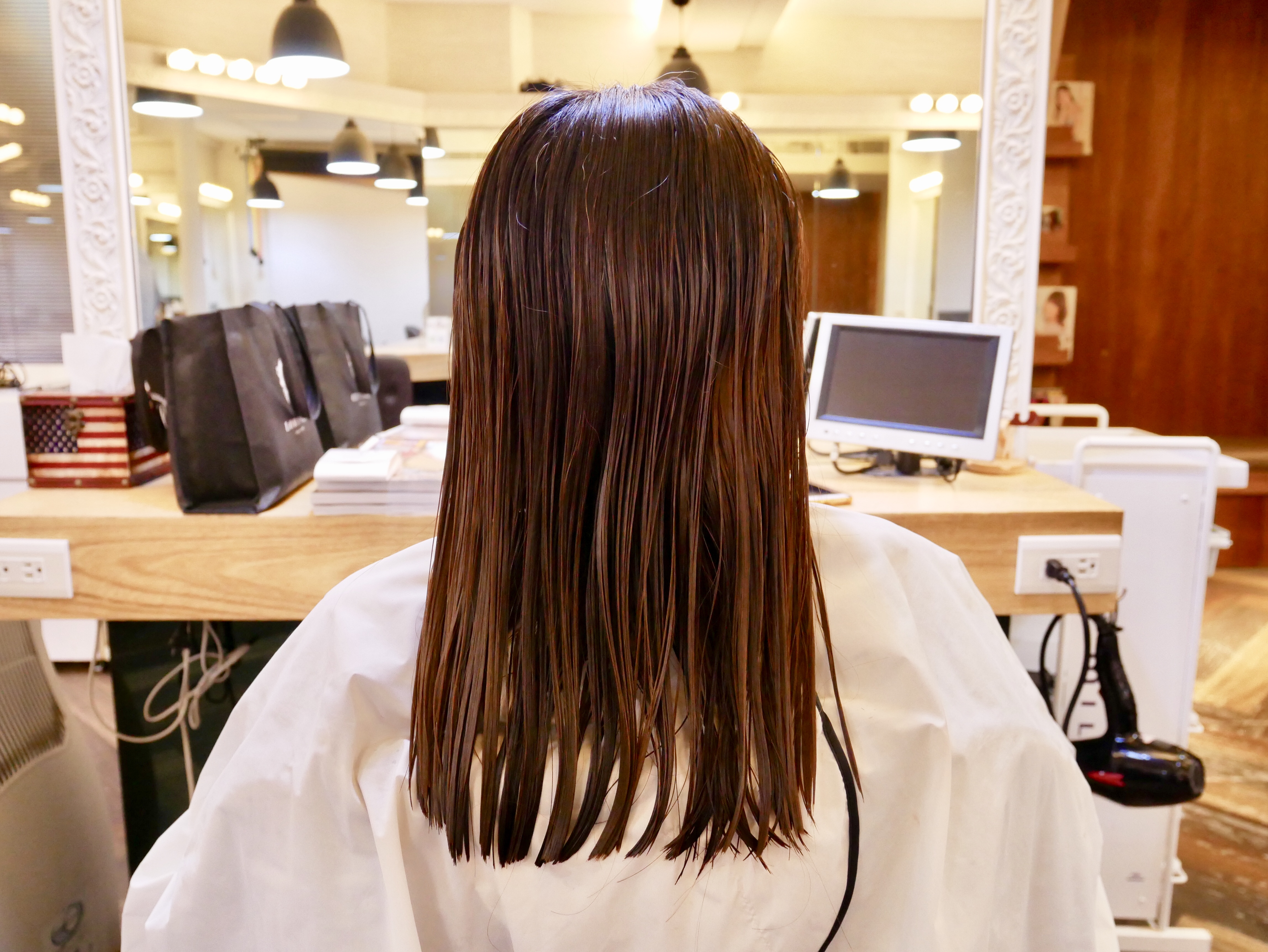 頭髮經過修剪後 , 雖然還是濕的 , 看起來卻很有光澤 , 這時候我偷摸了一下 , 整個是軟的 , 跟自己在家裡隨便護髮差很多