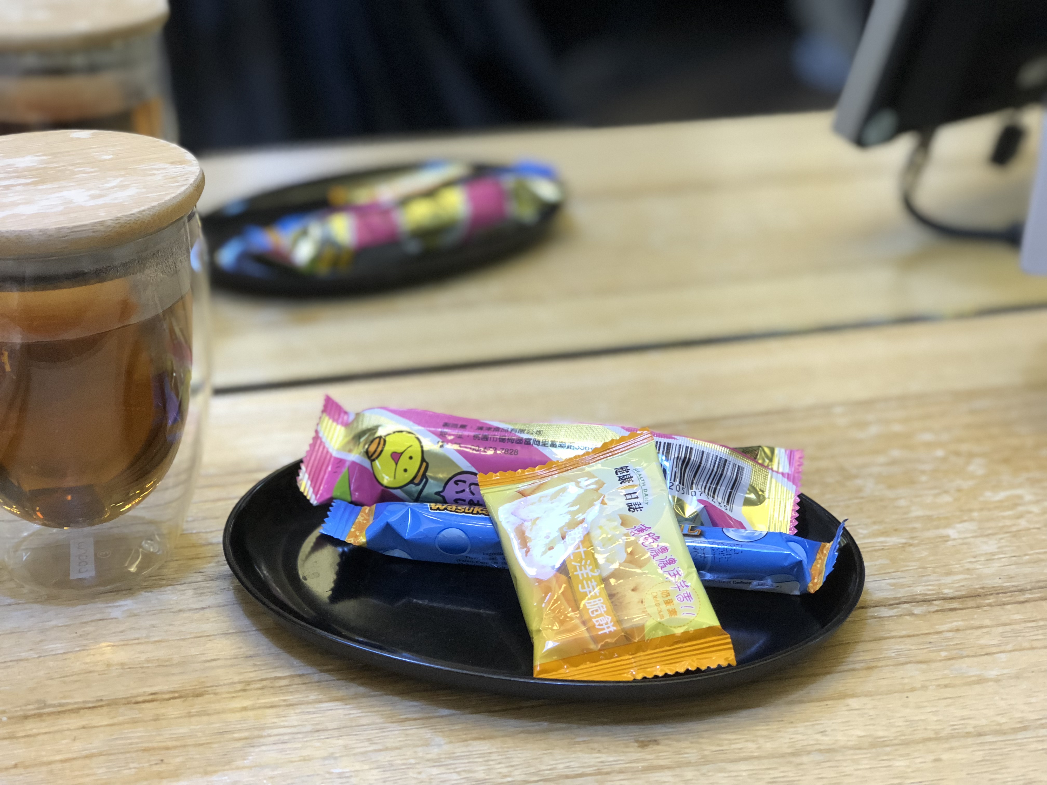 附的茶水有蓋蓋子 , 還有餅乾等點心 , 不怕等太久肚子餓