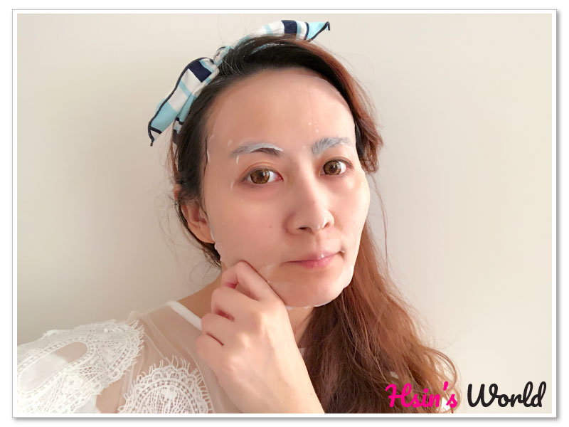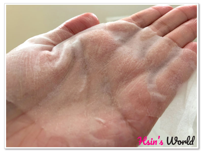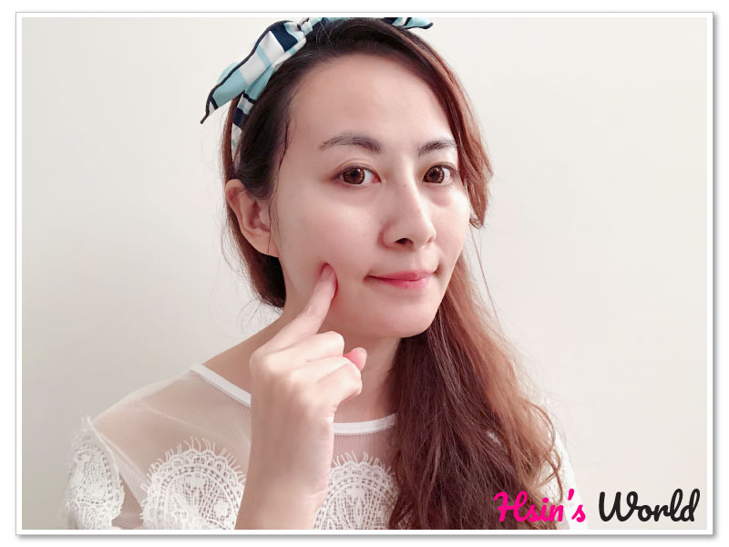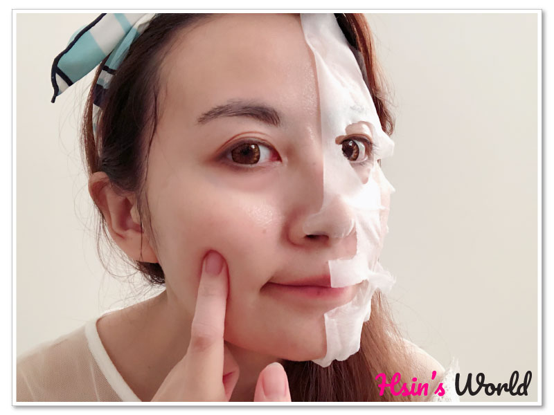 面膜精華有著淡雅的香氣,很舒緩的感覺,沒有刺鼻的酒精或是香精味,經過了十五分鐘後撕下面膜紙,看到自己的肌膚真是嚇了一跳,超級爆水的!像是擦了安瓶一樣,水嫩有光澤,皮膚吸飽了水小細紋都隱形了,而且水亮透光,才短短十五分鐘我皮膚就充滿光澤,用手指戳了一下臉頰,超Q彈的!