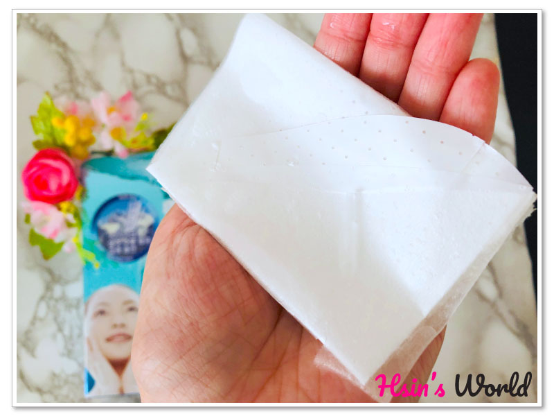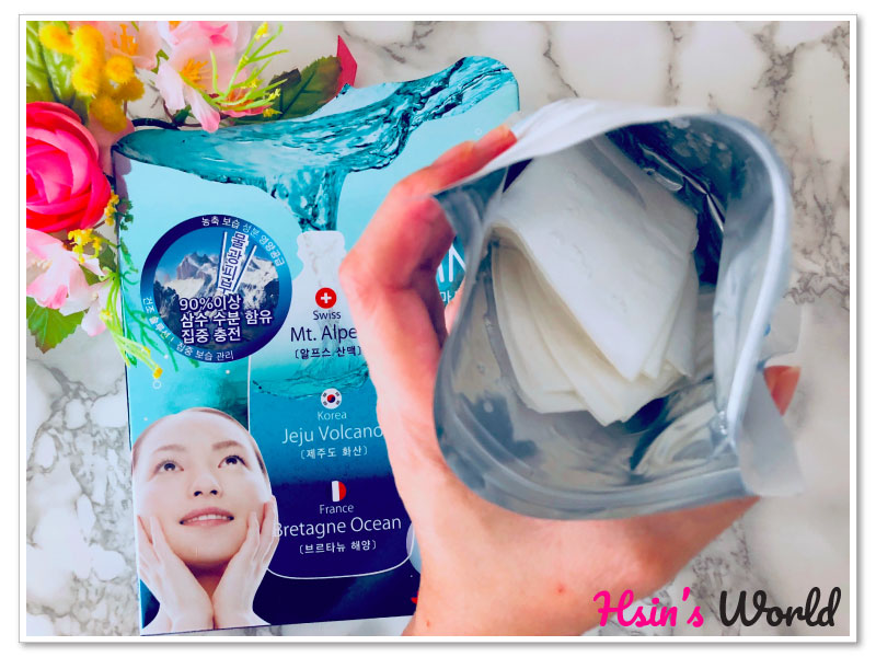 亮藍色的包裝是韓文為主的設計(這是當然因為來自韓國嘛!)背面包裝有中文標示以及使用方法圖示及介紹,打開紙盒包裝後是特大容量包裝的鋁箔包裝,裡面內含12片吸飽了精華的面膜,我以為會跟日系面膜一樣是一堆癱軟一坨的面膜放在袋子裡,沒想到是一張一張用珍珠襯紙分開,拿取容易之外吸附的面膜精華也很均勻。