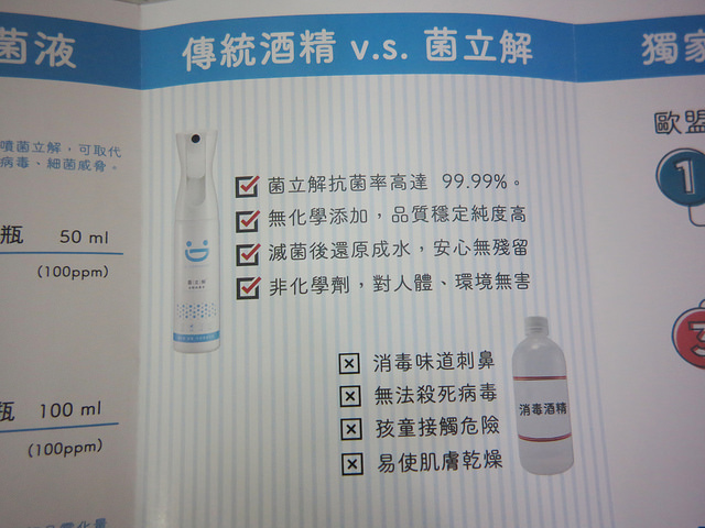 這次要記錄的是菌立解全防抗菌液,它的主要成分是微酸性的次氯酸抗菌液,採用歐洲獨家專利技術保護的設備,提取生成強氧化抗菌的次氯酸電解水,其抗菌效果比酒精和漂白水更佳,與一般常見的次氯酸抗菌液比較,菌立解的純度高、穩定度高、無雜質,作用後也不會產生鈉殘留的問題。
