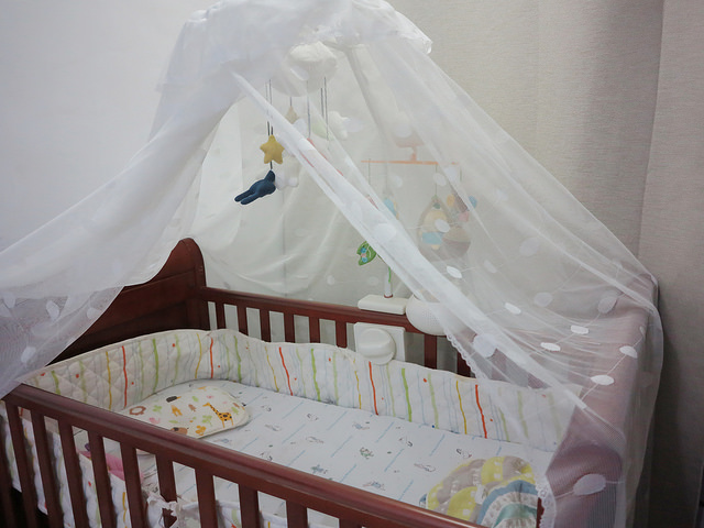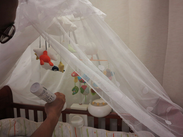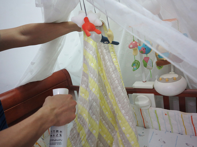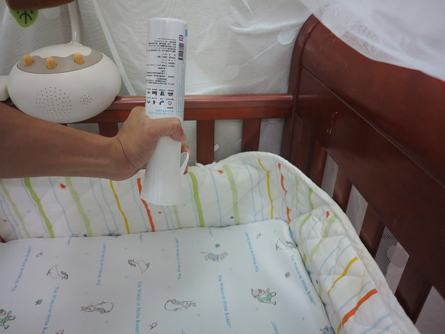 睡起來,再喝個奶,又要去遊戲區玩了,趁她在遊戲區東摸摸、西摸摸的到處探索時,趕快來消毒她的小床,再通通風,等她要回來進行第二段小睡時,就完全沒有噴過菌立解的氯味了~