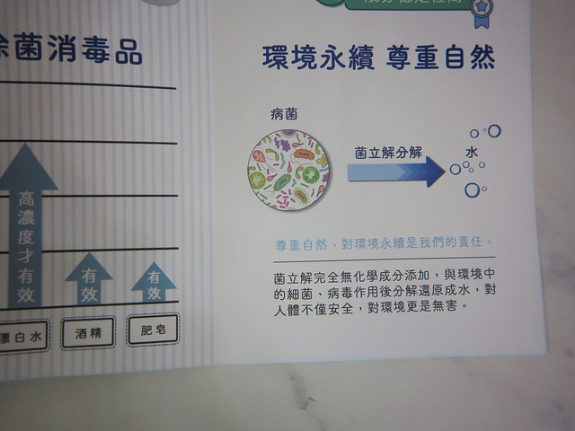 因為芒果妹妹正值喜歡把抓到的東西都往嘴裡塞的年紀,所以我對於消毒藥劑一直都有點怕怕的,但看到菌立解標榜滅菌後就會還原成水,感覺就可以放心地拿來消毒環境了