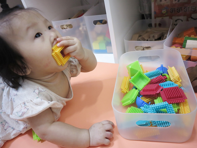 整盒的鬃毛積木,不論顏色還是形狀大小,都剛剛好可以被她的小手輕鬆握取,一拿到就迫不及待地往嘴裡塞...