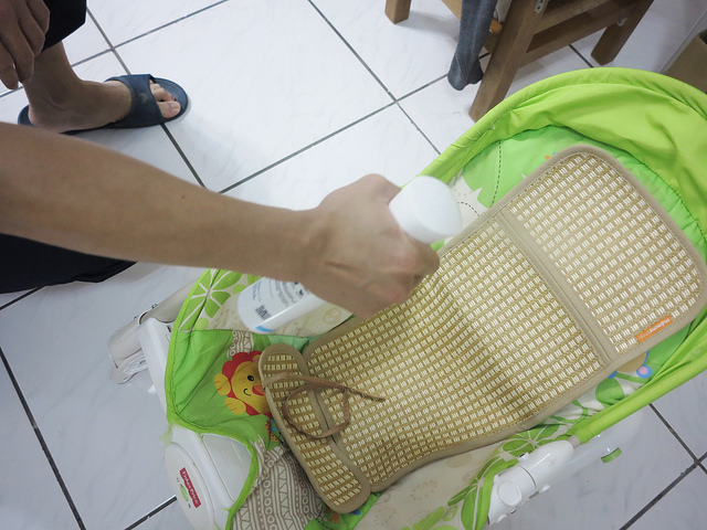 芒果妹妹目前都是坐在安撫椅上吃副食品,現在還會自己坐在上面拿著蔬果棒邊咬邊玩,有時沒拿好,蔬果棒就掉在安撫椅上了,所以安撫椅也是每天必消毒的物品