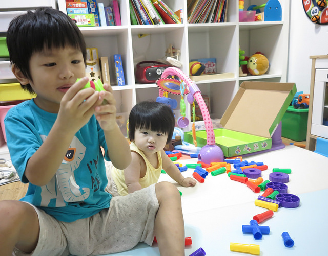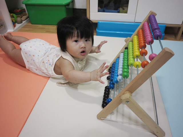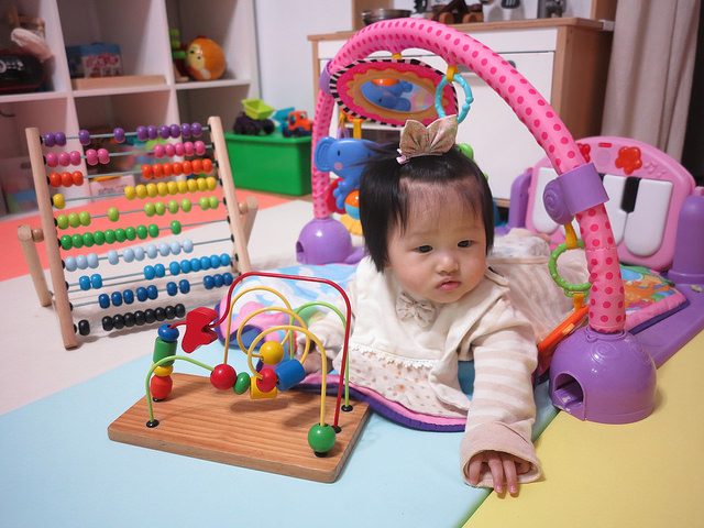 芒果妹妹現在每天起床,喝完奶後都要到遊戲區玩個一兩小時,才會再回到小床上進行白天的第一段小睡