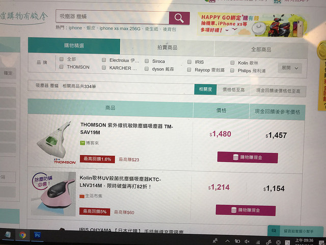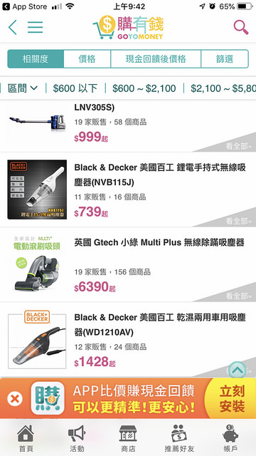輸入吸塵器,就會看到有各式各樣的吸塵器,可以根據相關度、價格、現金回饋後價格來做排序依據。