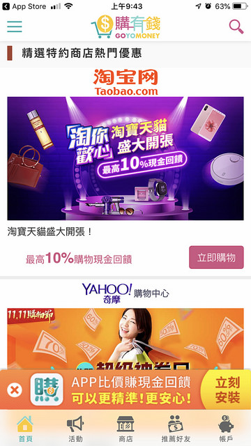 最近雙11淘寶已經摩拳擦掌地提供了各項優惠,沒想到在購有錢還有最高10%的現金回饋。