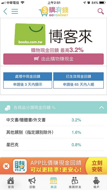 以博客來書店為例,他會顯示65天後現金回饋才入帳,中文書、外文書3.2% 但其他類別只有1.6%。