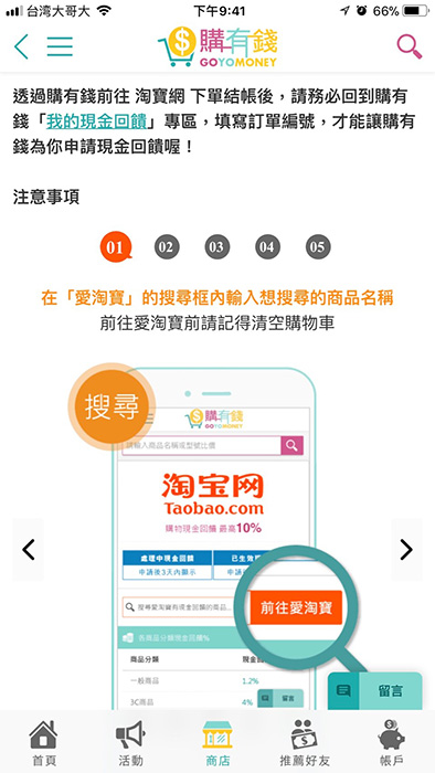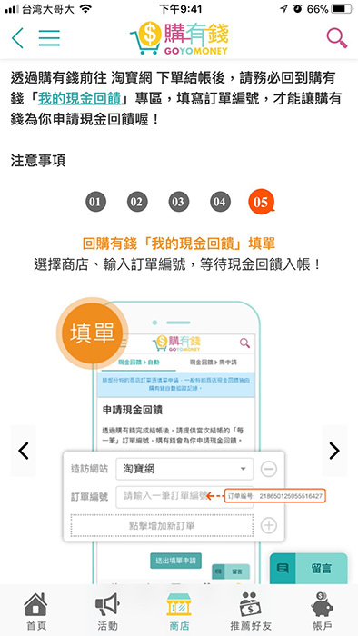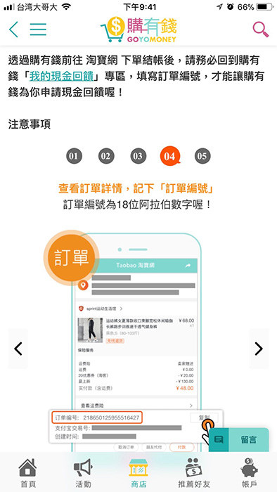 :idea: 如果你要賺淘寶的回饋,記得購買之後要回到購有錢平台寫下訂單編號才可以認列喔!所以各個平台還是有點小差異,大家要注意一下,千萬別和高現金回饋過不去啊!