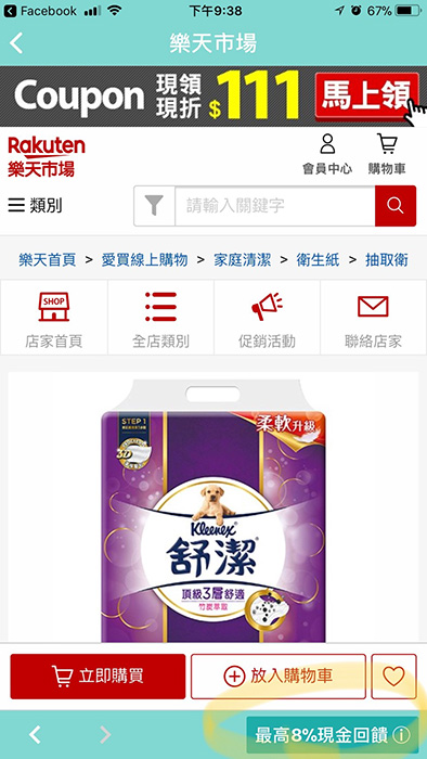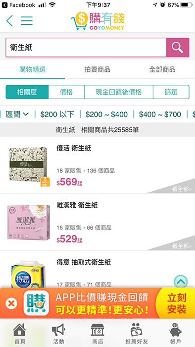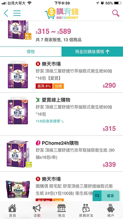 首頁上也有整理了大家都很愛搜尋的熱門項目,我們用衛生紙來舉例,購有錢平台還會幫你列出哪一個平台最便宜,甚至是現金回饋後,哪家最便宜都有喔!