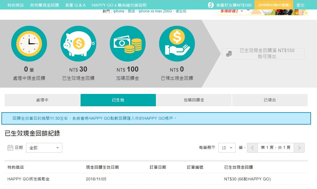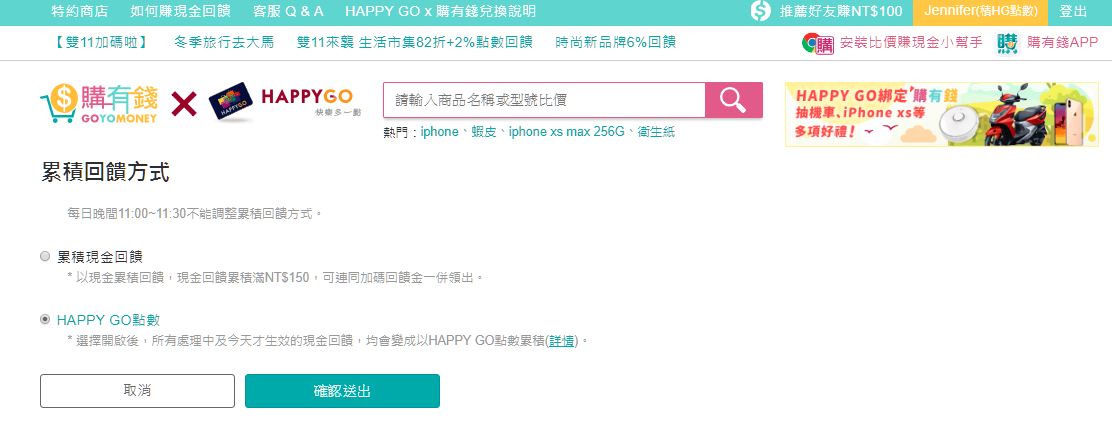 因為購有錢平台和happygo有串聯,所以累積回饋的方式可以有①現金回饋或是②happygo點數二選一,如果沒有去選擇,平台會直接幫你選happygo的回饋方式,但是如果你和Jennifer一樣不熱衷累積happygo點數,請千萬記得到後台修改累積回饋的方式喔!