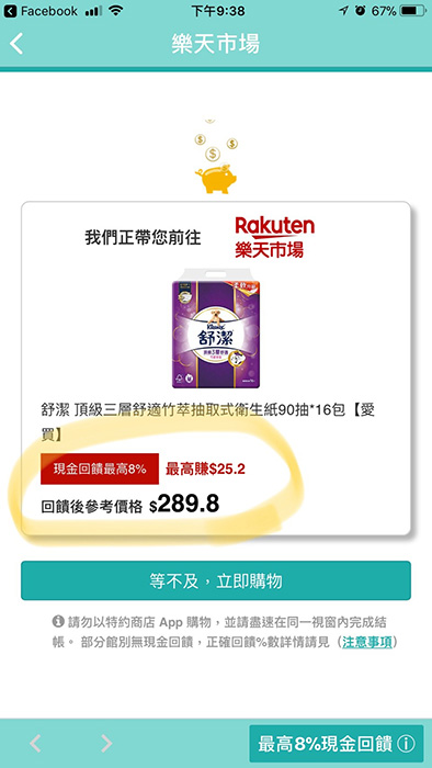 像我選了樂天市場平台後,購有錢導過去樂天的轉換頁面,它會直接和你說,這個交易你可以獲得多少現金回饋,完全可以很無腦,看數字就好。