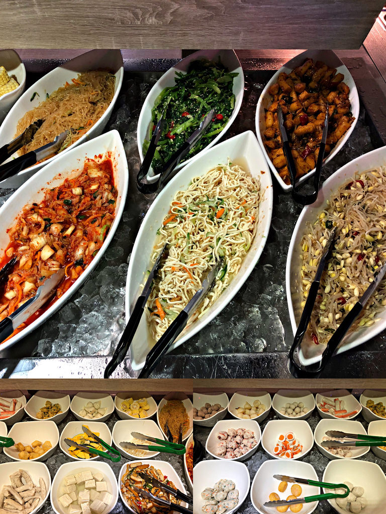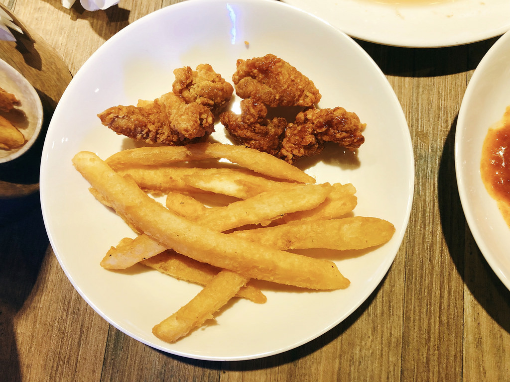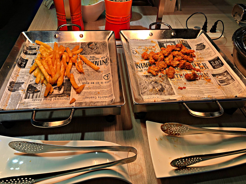 連涼拌的菜色都有,還有炸薯條以及韓式炸雞;還有韓式泡菜炒肉、辣炒年糕…多樣選項