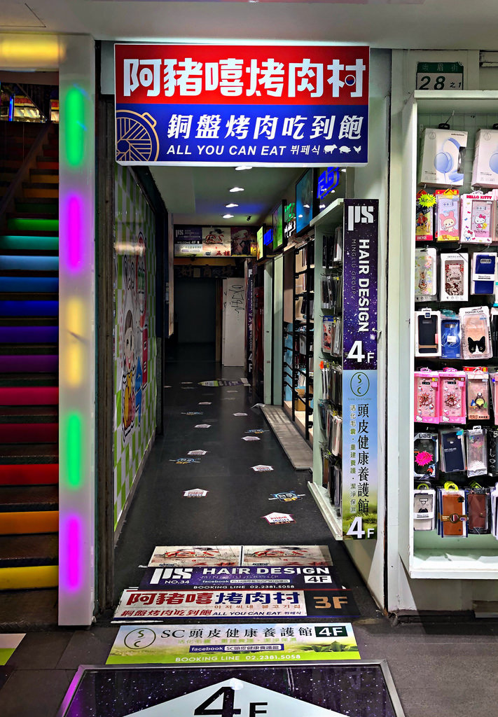 從西門町六號出口出來,走到肯德基,再轉進肯德基旁的峨嵋街,沒多久就可以看到阿豬嘻烤肉村