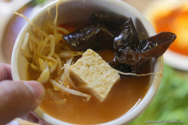 有豆芽熬煮的甜味與木耳的膠質加上泡菜本身的酸度達到了湯頭的平衡點