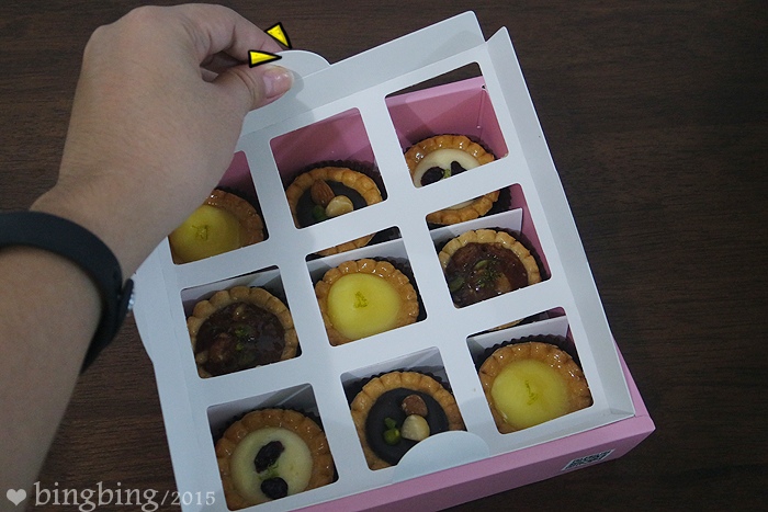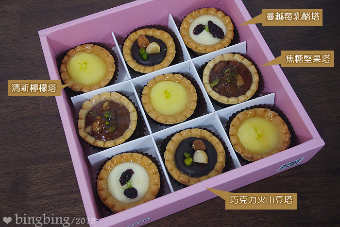 口味及數量分別為:巧克力火山豆塔X2、清新檸檬塔X3、蔓越莓乳酪塔X2、焦糖堅果塔X2