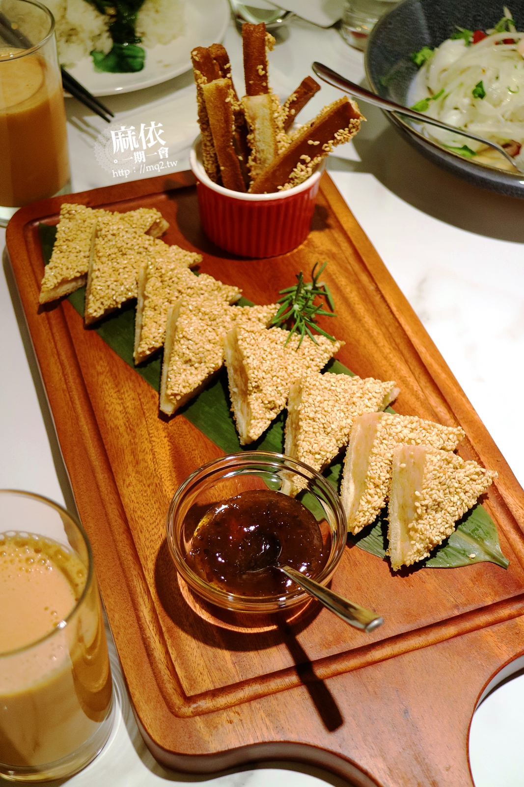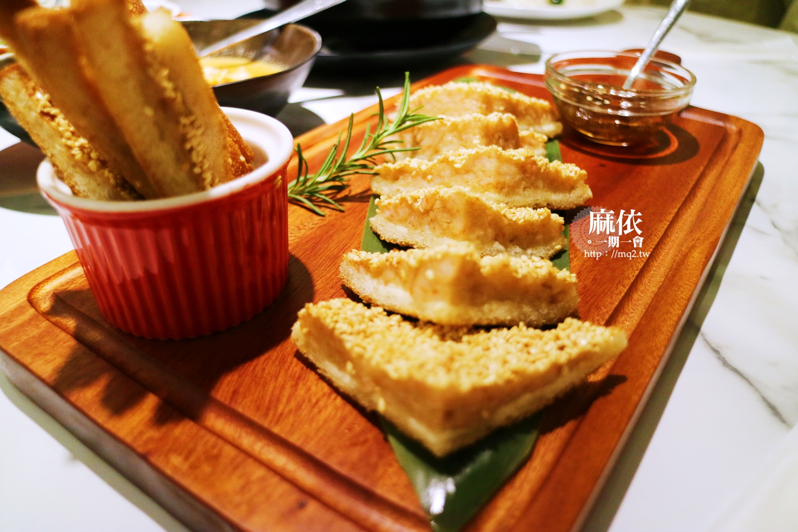 主要是鮮奶吐司裹上新鮮的草蝦泥、外層再鋪滿芝麻,下鍋油炸,口感吃起來很酥脆,因為外層有大量的芝麻,比起蝦泥味,更多的是白芝麻的香氣阿~
