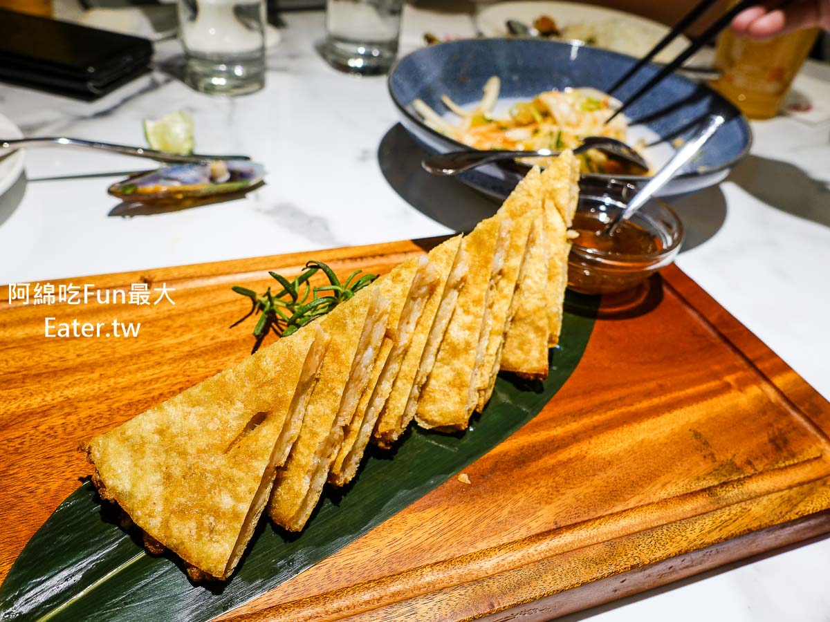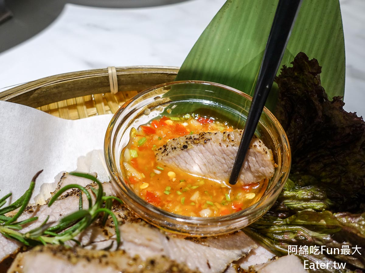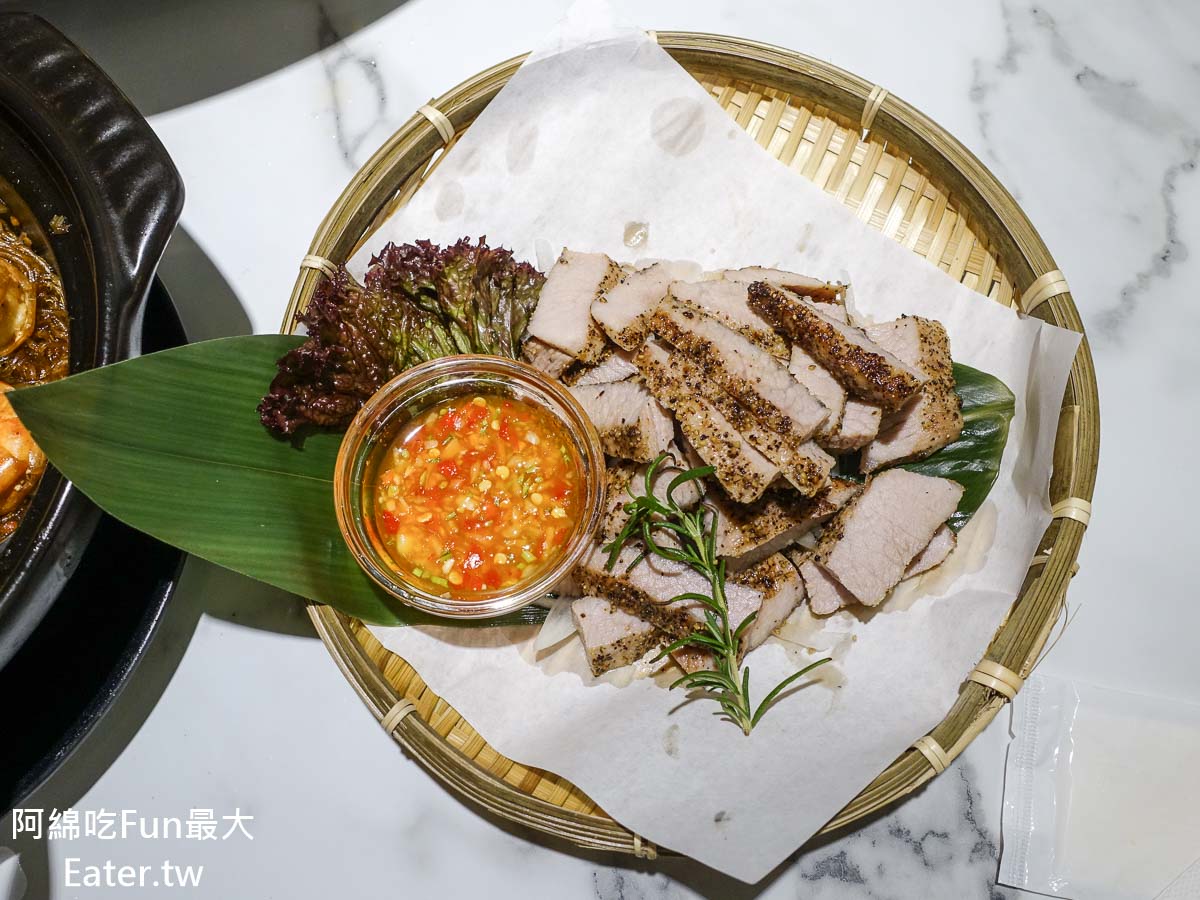 椒鹽松阪豬看起來很像鹹豬肉,上頭只用岩鹽和黑胡椒提味,簡單的調味反而可以吃出肉質好壞,朋友說吃起來都沒有豬腥味,而且厚度剛好,吃起來有彈牙口感,調味適中,沾著泰式沾醬吃更加好吃!