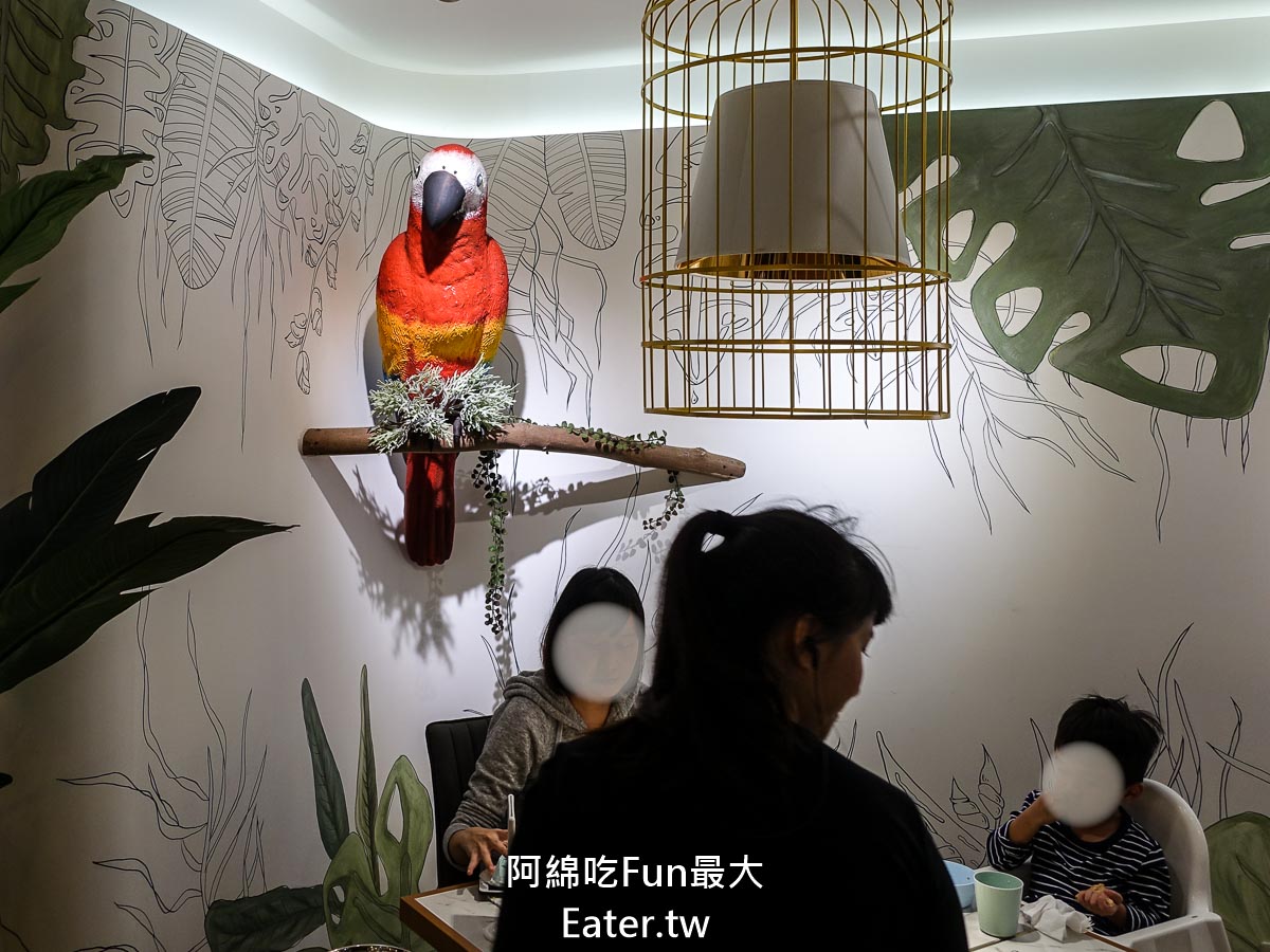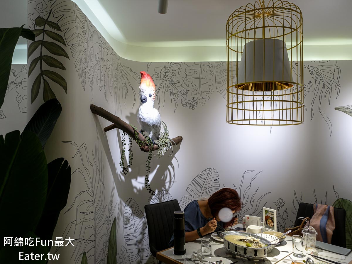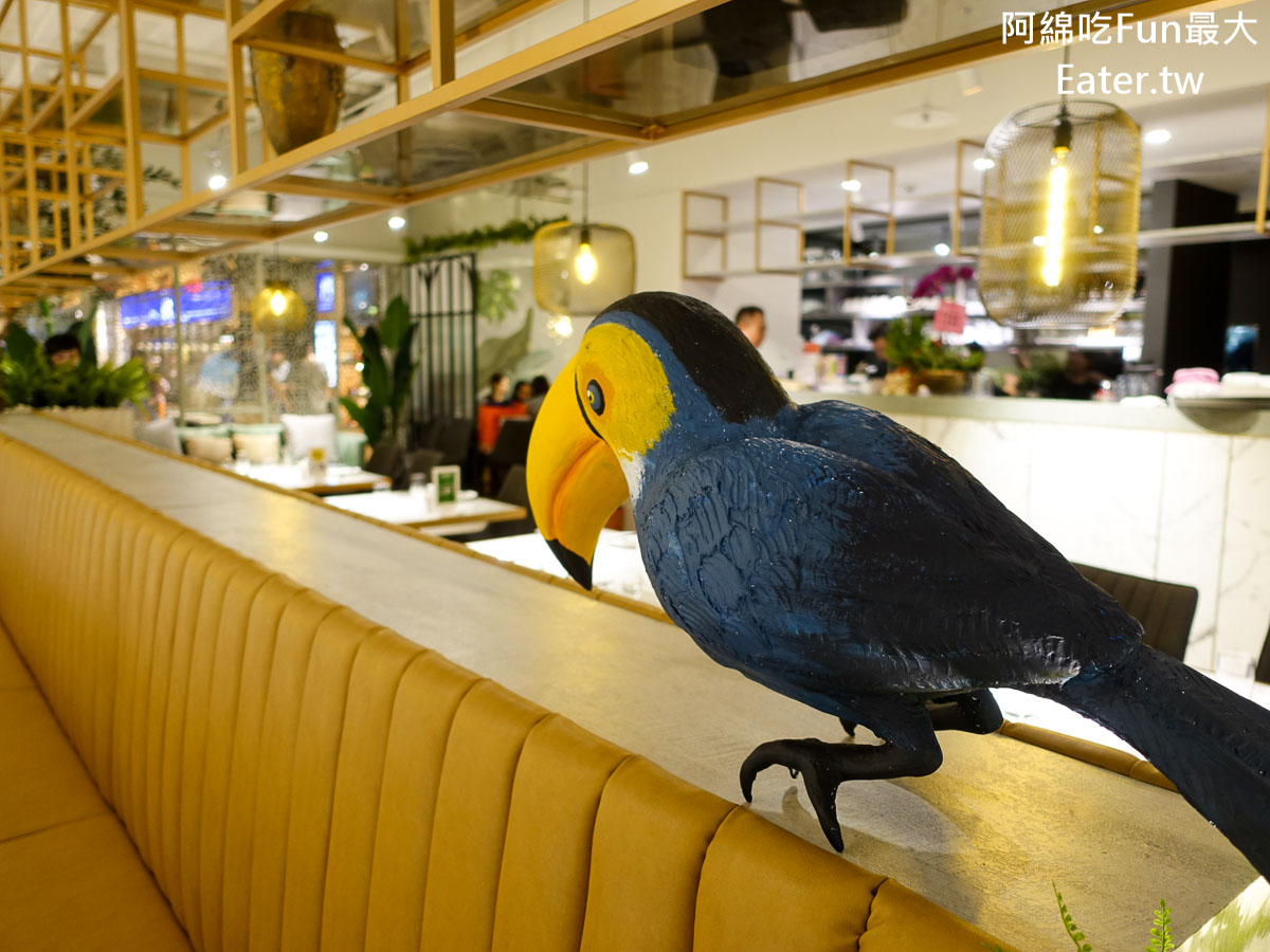 除了熱帶植物和彩繪牆面營造出的南洋叢林風,還有栩栩如生的立體鸚鵡陪你用餐。