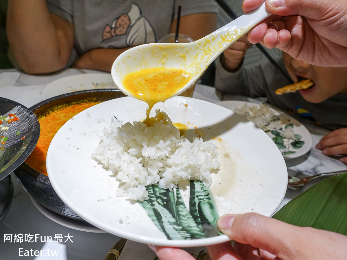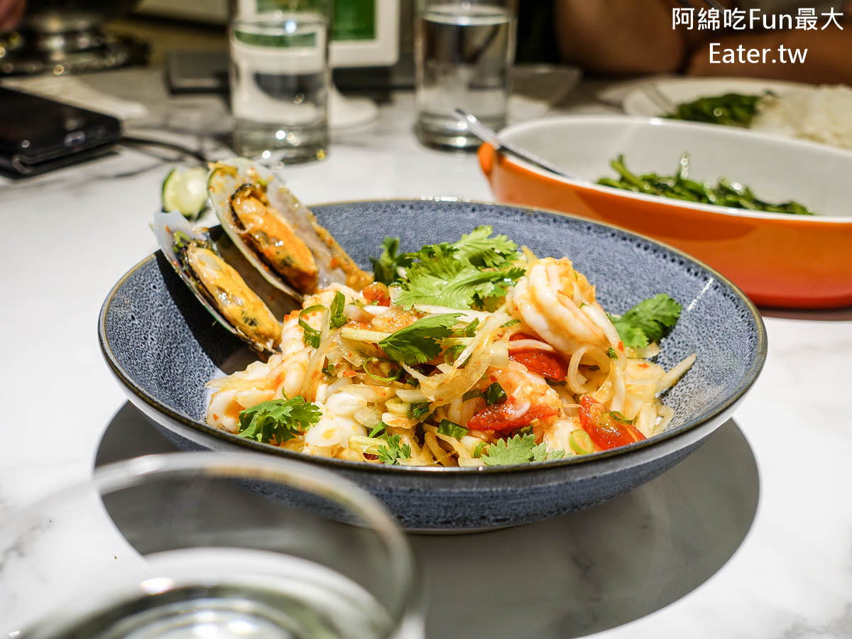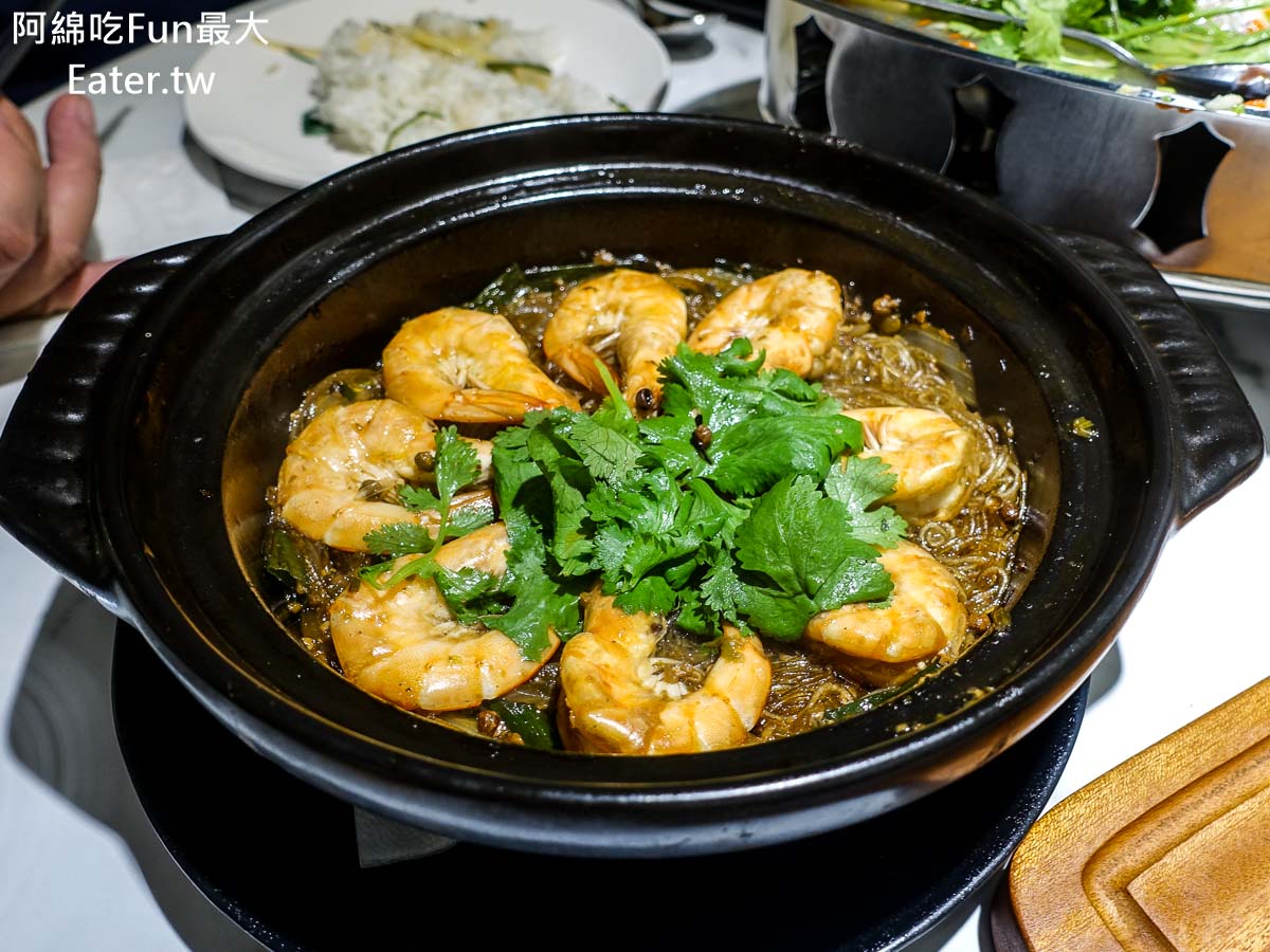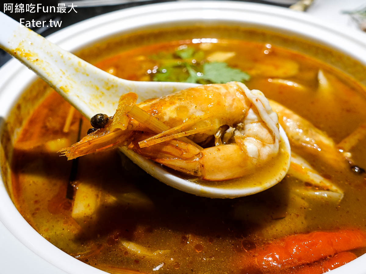 酸辣蝦湯用了大量香茅、南薑、檸檬葉熬煮,喝起來酸辣到一個極致,果然是泰式料理湯的代表。