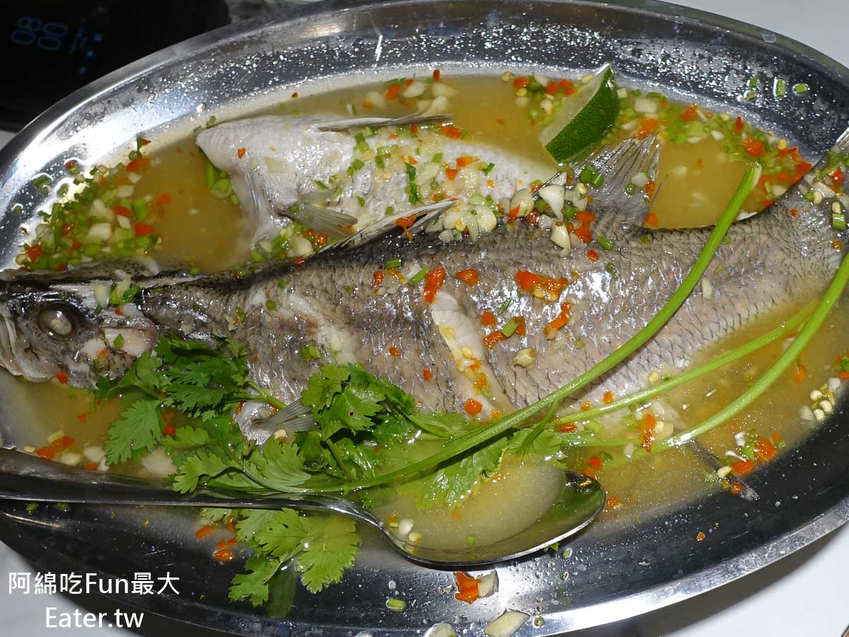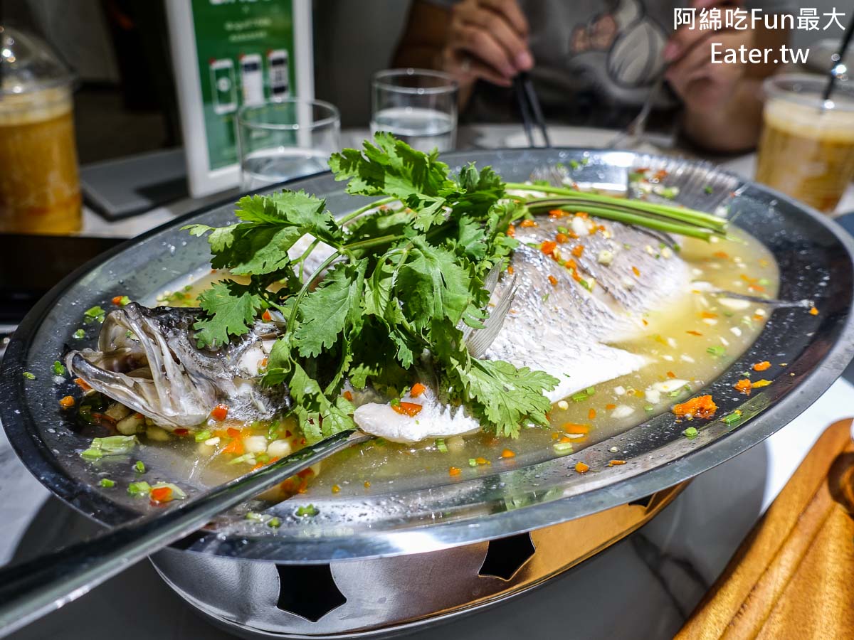 檸檬清蒸魚好大一條,一整條鱸魚在爐子上加熱,我們等他煮久一點比較入味再吃,清爽檸檬酸帶出魚肉的甜,鱸魚魚肉很鮮嫩,魚刺也不多,用湯匙就能挖起食用,煮魚的微辣醬汁拿來拌飯也蠻好吃的!