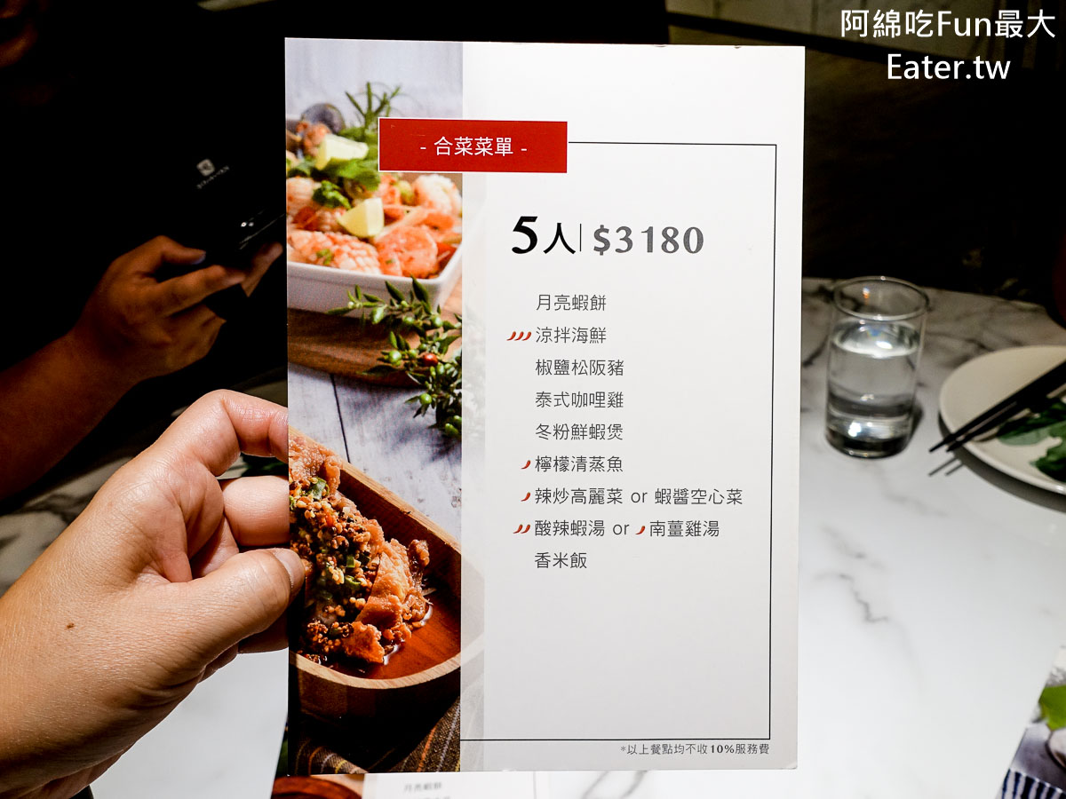 菜單有分成單點和合菜,單點菜單就像一本精美的雜誌,合菜就分成3、4、5人三張菜單,單點的話,沒有海鮮或肉類是180-260元/道,有海鮮或肉類的話是300-480元/道 (單點須另加收10%服務費) 合菜則是不收任何服務費,懶得動腦也想省點錢就點合菜吧!