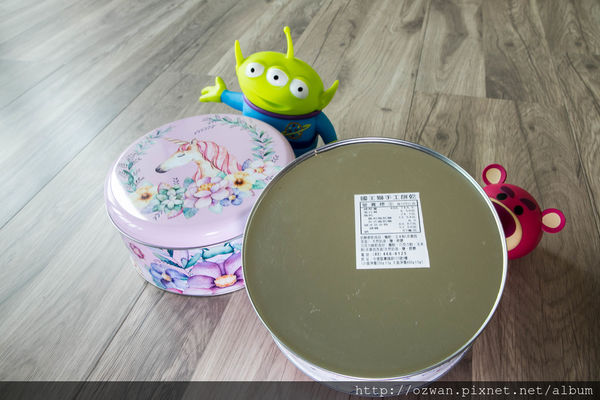 鐵盒底部有品名、成分、熱量標示、製造日期、有效期限。