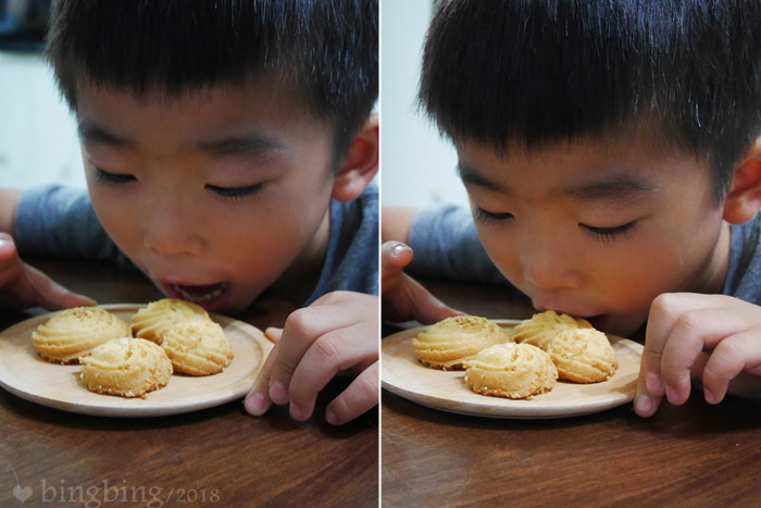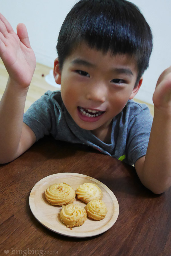 看看大老闆開心的樣子,根本樂歪阿他,因為他好喜歡原味的曲奇餅乾