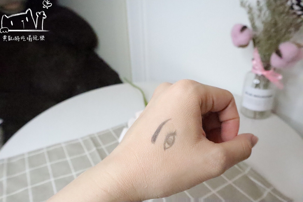 幫手背擦上粉底液,畫上眉筆和眼線筆。