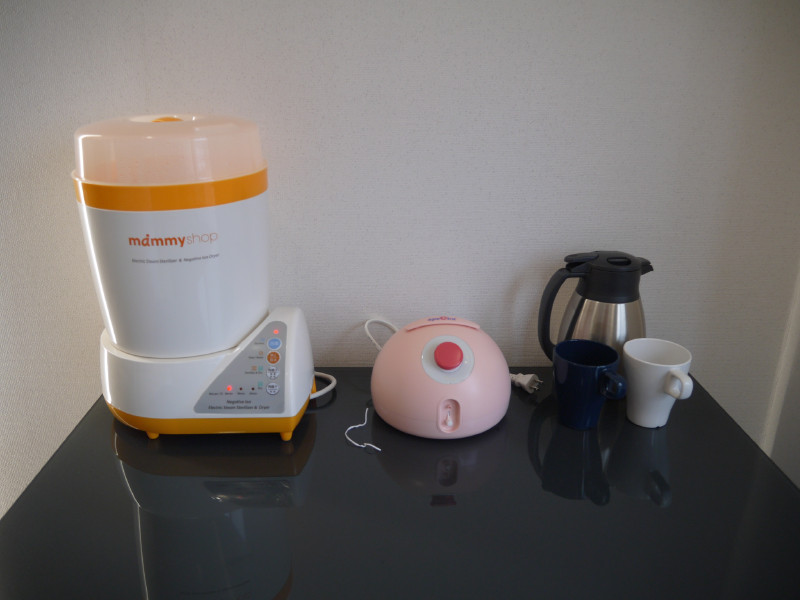 房內的硬體設備有消毒鍋 擠乳器 冰箱 浴室暖風機