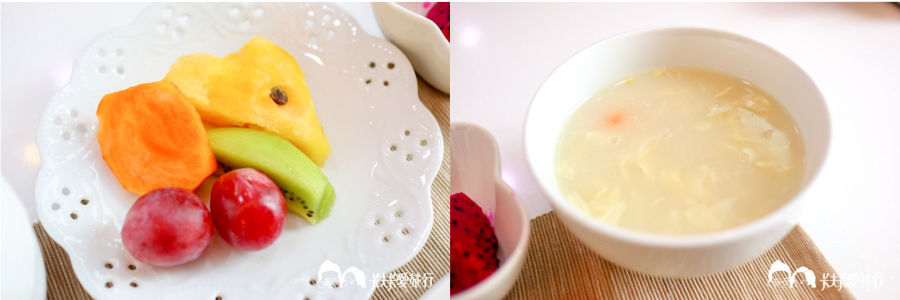 水果是當季的蔬果,很甜很好吃,玉米濃湯部分是管家好手藝烹調的,十分鮮美可口,不一定每次都喝的到喔