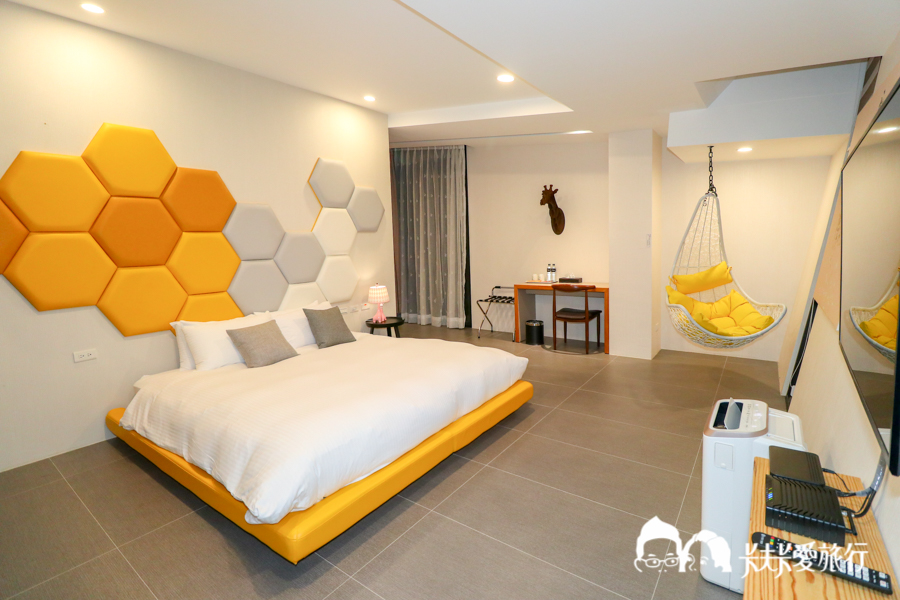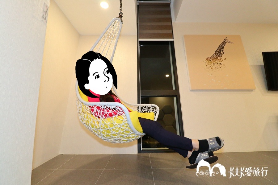 這間房間以長頸鹿為主題,因此牆面以活潑的暖黃色為主,也是今晚卡夫卡入住的房型,這間適合情侶或夫妻入住,還有可愛的吊椅喔