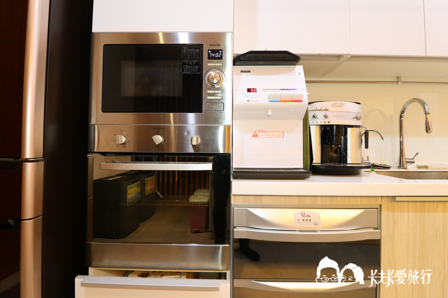 飲水機、咖啡機、微波爐及烤箱一應具全