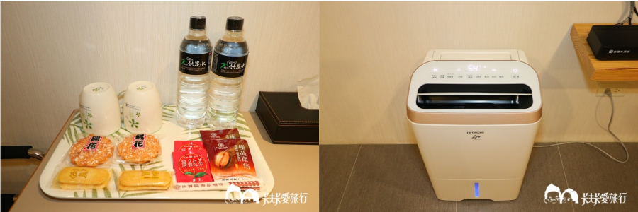 (左) 房內的小Mini Bar,吃不夠可以去樓下廚房拿喔 (右)每間房內都有hitachi的空氣清淨機,除了空氣清淨外也有除溼功能