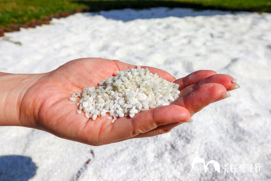 沙坑是採用粒狀的白色石頭,這種石子比較好清洗,不會沾黏到全身都是,這點非常貼心
