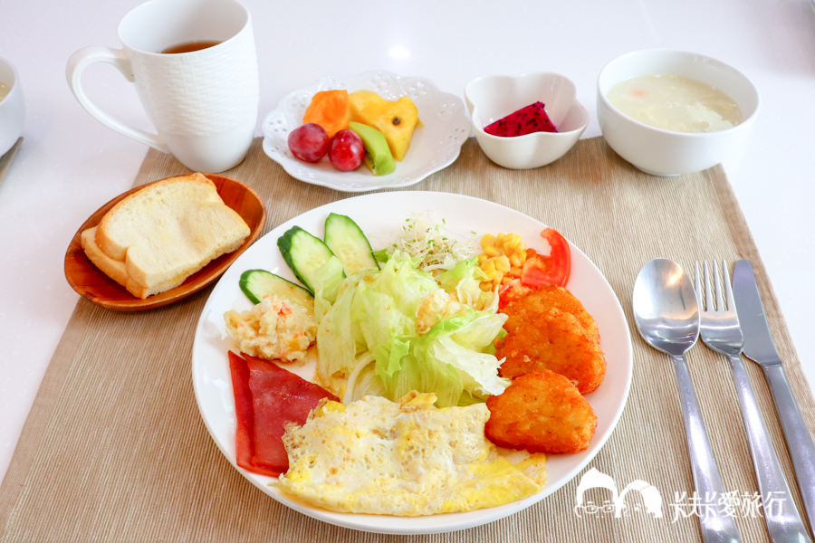 有煎蛋、馬鈴薯沙拉、煎火腿、生菜(小黃瓜、玉米、番茄)及薯餅,還有新鮮水果與濃湯