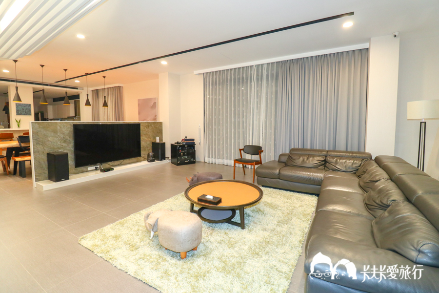 一樓的客廳空間提供住房的客人使用,有液晶電視與高檔音響設備,搭配真皮沙發