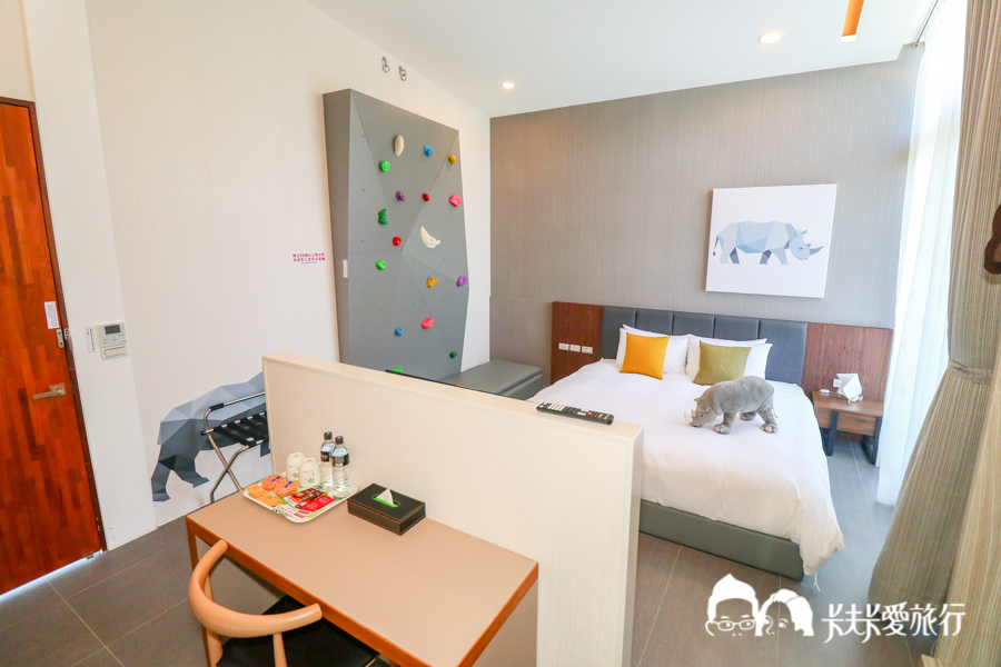 以犀牛為主題的雙人房,還有一打開門就令卡夫卡驚豔的攀岩牆,有哪間民宿會在房內裝設攀岩牆,大概只有悠悅光新樂館了,超級想玩看看的,但是卡夫卡是叔叔級了不能玩,以免攀岩牆倒塌