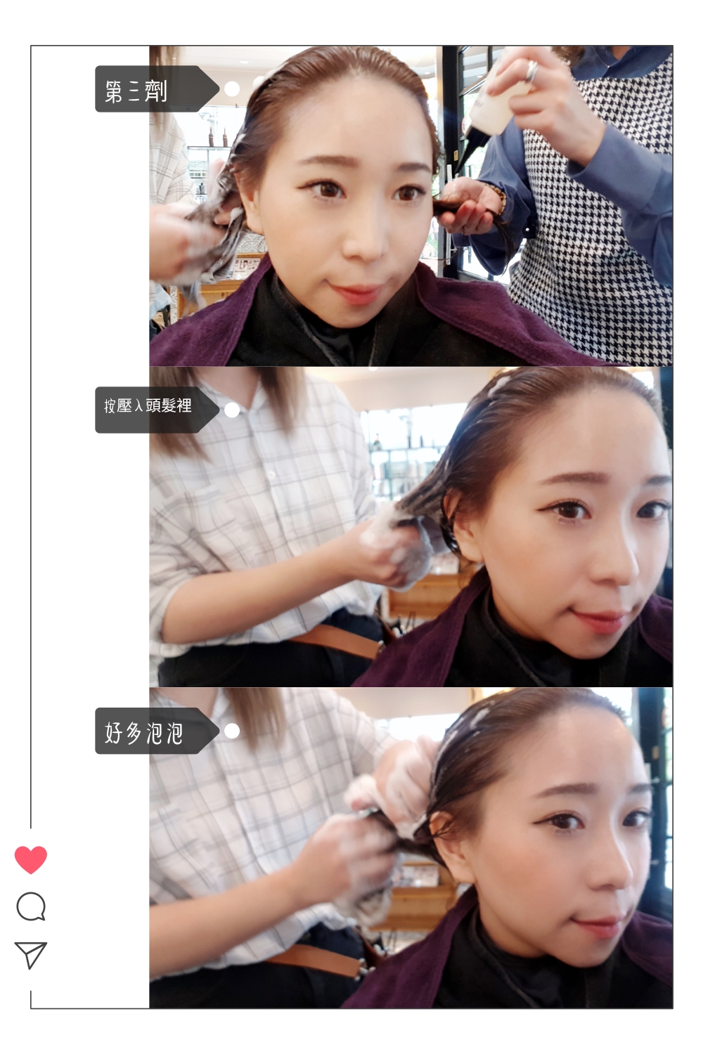 整個過程中最有趣的部分是在上哥德式髮品milbon第三劑時,可以看到造型師將她按壓在頭髮的過程中,產生了許多綿密的小泡泡,這是因為milbon奈米級小分子開始作用,將毛髮修護成分「SSVR SILK」導入毛鱗片中,因此可以大大提升毛髮內密度,吹乾後的髮質會感覺更豐盈和健康。