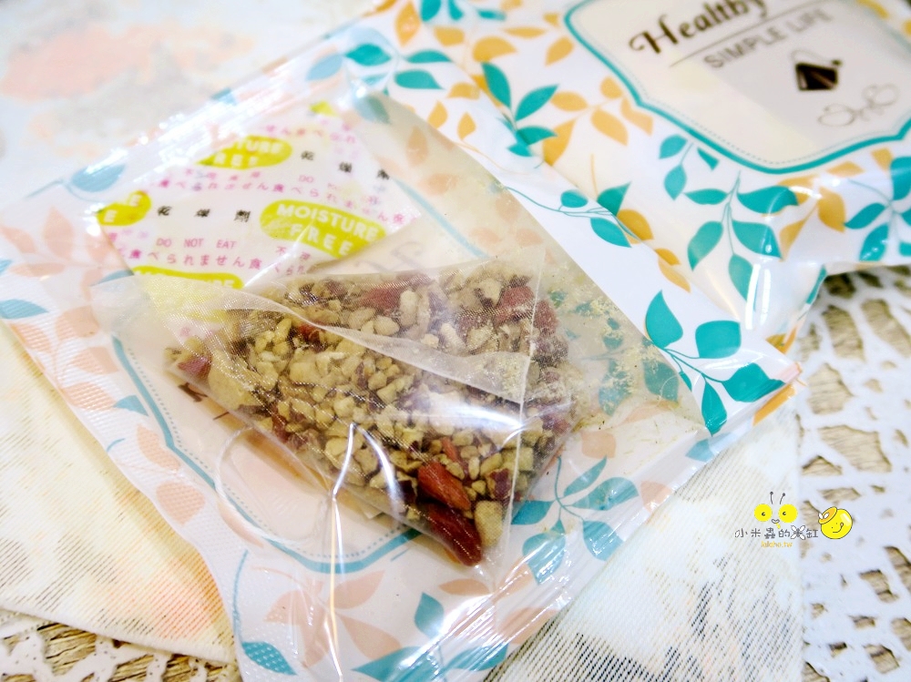 將袋子拆開後,三角茶包裡面裝的是紅棗、枸杞、桂圓與花旗蔘粉 ,真材實料清楚看的見 ,一旁還附有乾燥劑,可以防止裡面受潮。