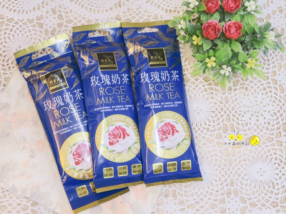 拆開後,發現裡面不只有一個奶茶包,還多了一個玫瑰花的三角立體茶包與攪拌棒,這樣的奶茶包也太精緻了吧!我第一次看到這種操作,感覺喝奶茶都高尚了起來!
