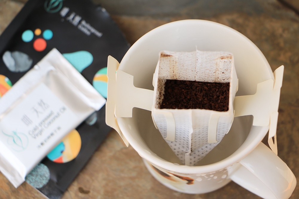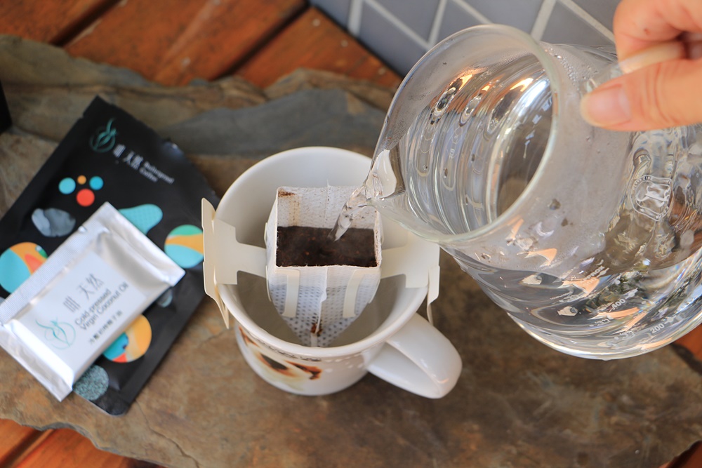 將左右掛耳撐開掛於杯緣上,再依序分次慢慢注入180cc熱水沖泡。 隨著熱水蒸氣,空氣之中瀰漫著咖啡豆淡淡香氣。
