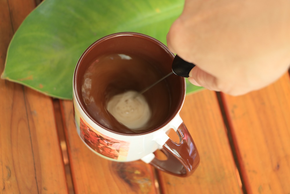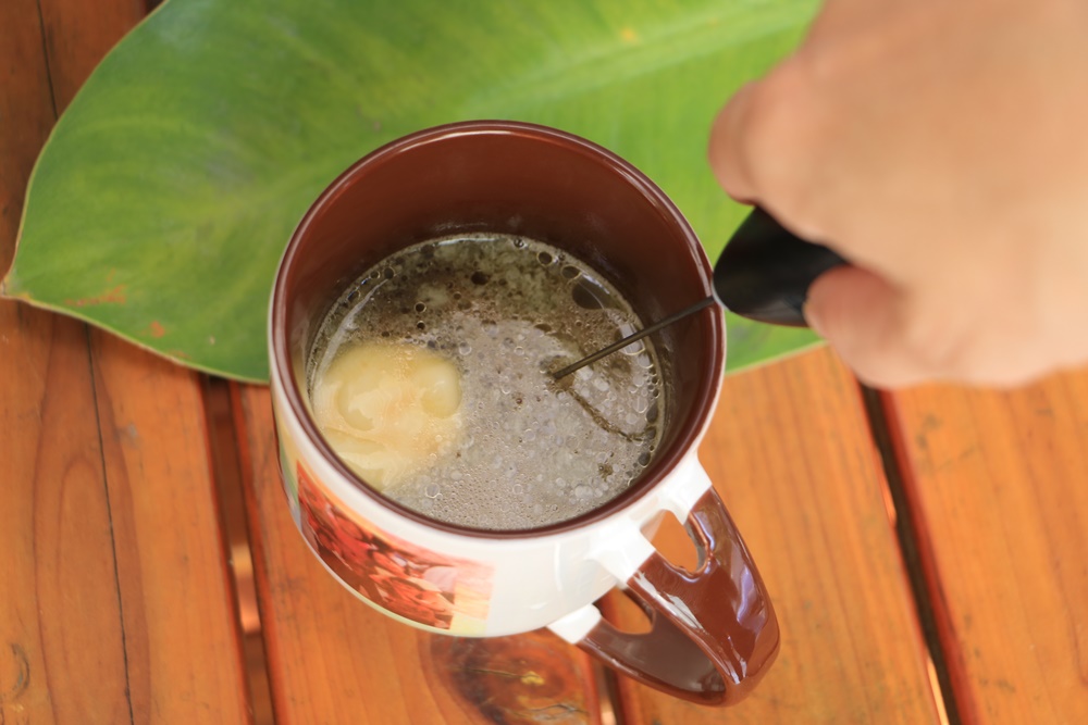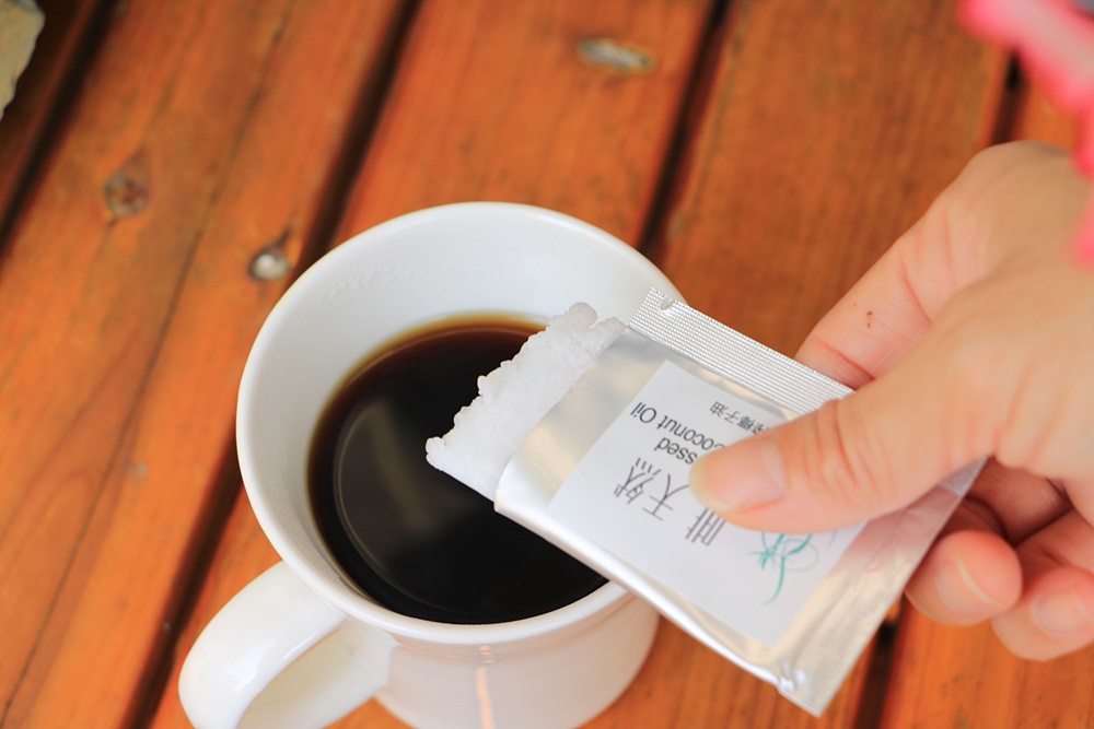 接著加入冷壓初榨椰子油,快速攪拌溶於咖啡中即可。 純椰子油在室溫低於25度C時會凝固,隨著空氣溫度升高,油品漸漸恢復成液體,這是椰子油正常現象。 濃郁椰子香氣夾雜著淡淡咖啡清香,入喉香醇、還有油脂的濕潤度,非常順口。