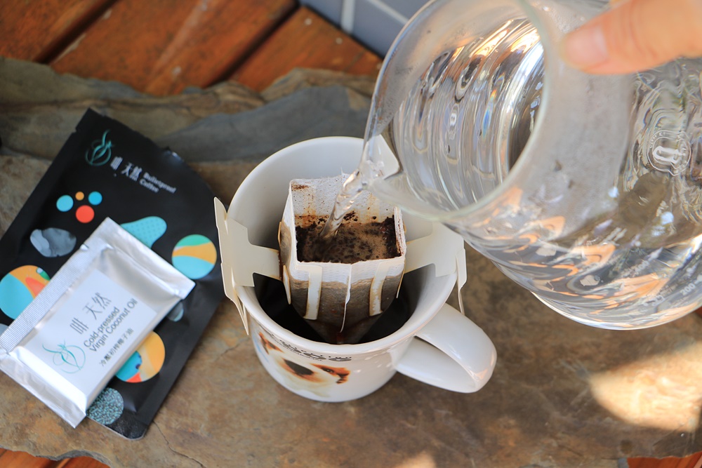 沖泡方式跟一般掛耳式咖啡一樣,先注入180cc熱水手沖過後,再加上椰子油攪拌即可。 Hank媽是好奇寶寶,忍不住就想試試加上椰子油口味的咖啡喝起來是怎樣的口感??!!