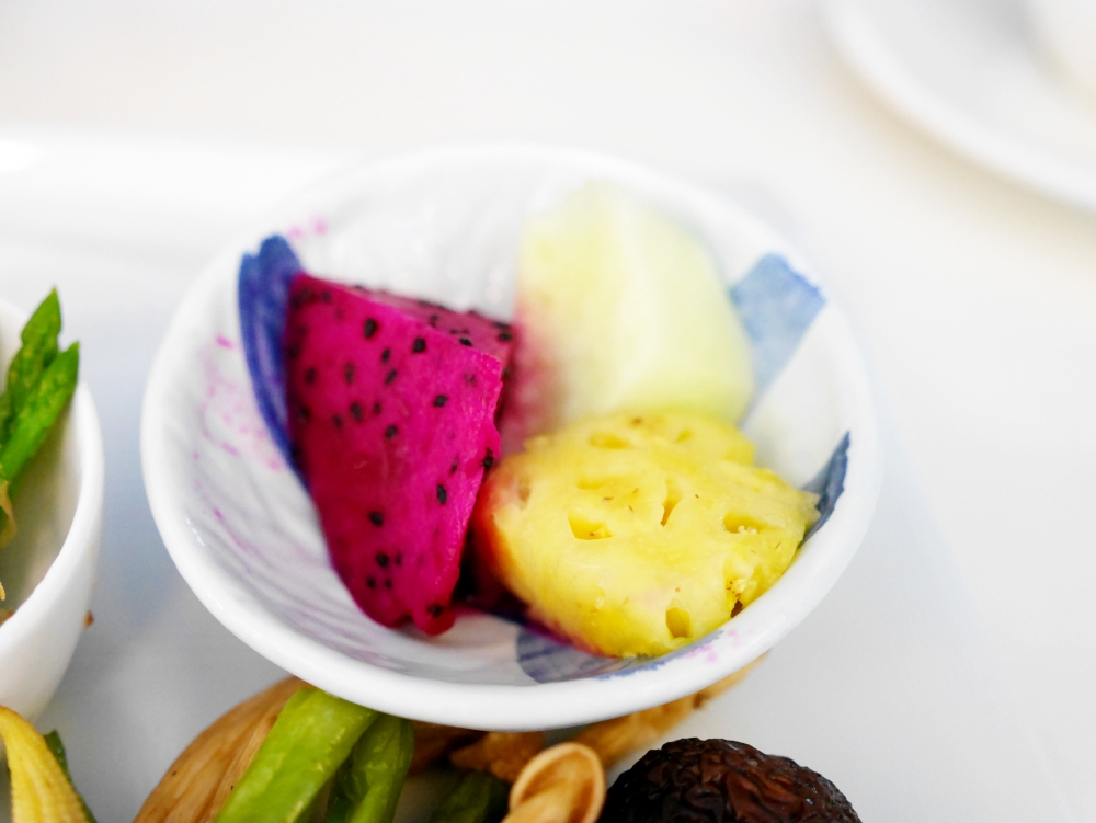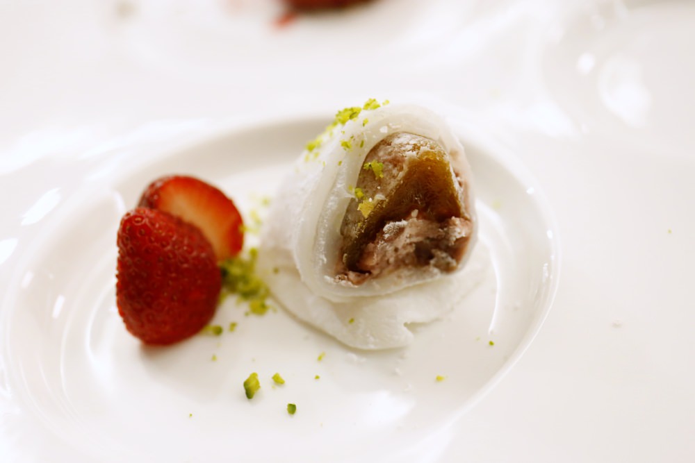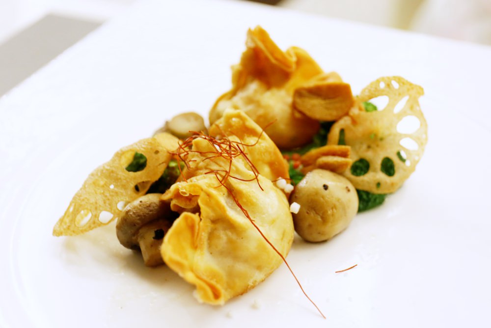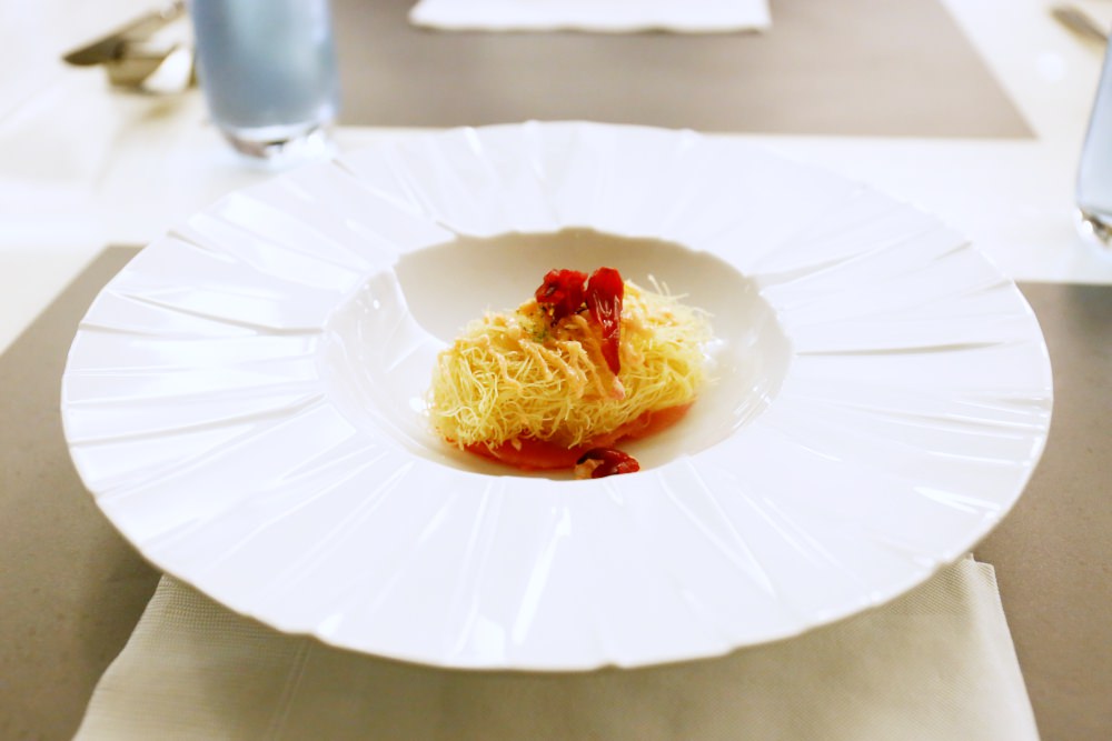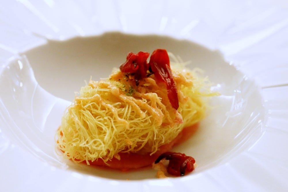 脆絲干貝搭梅汁蘿蔔佐明太子醬
