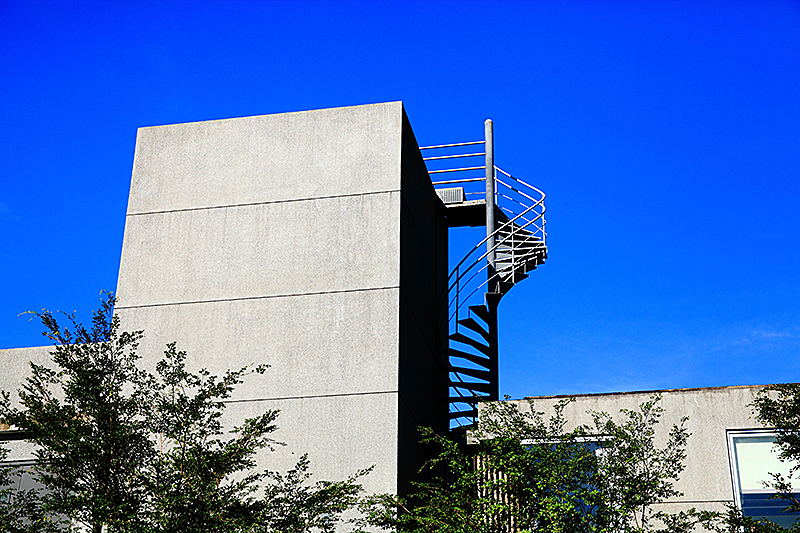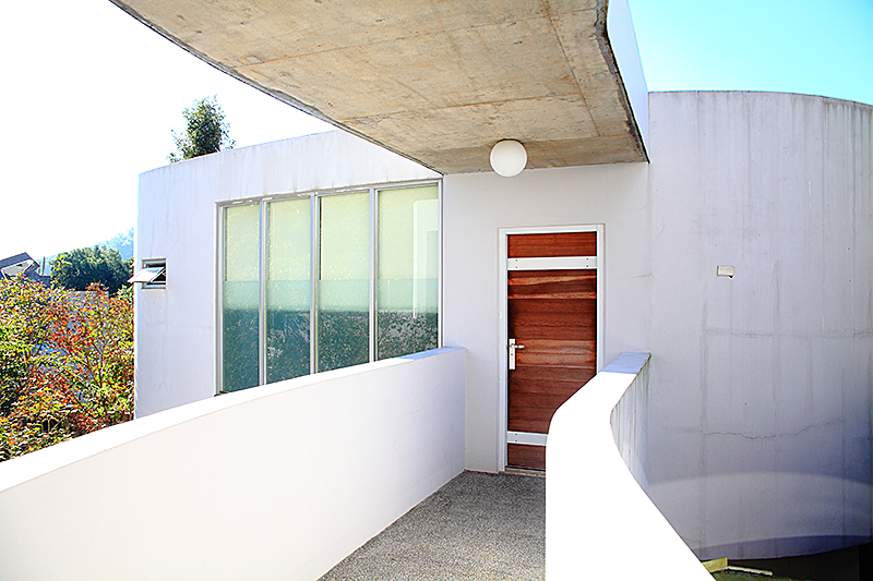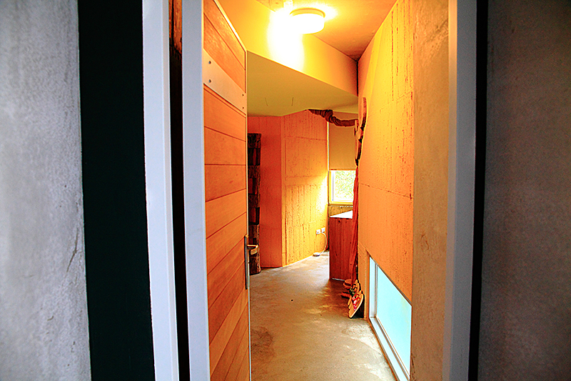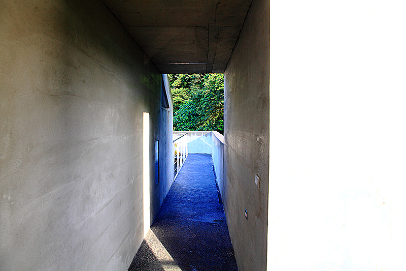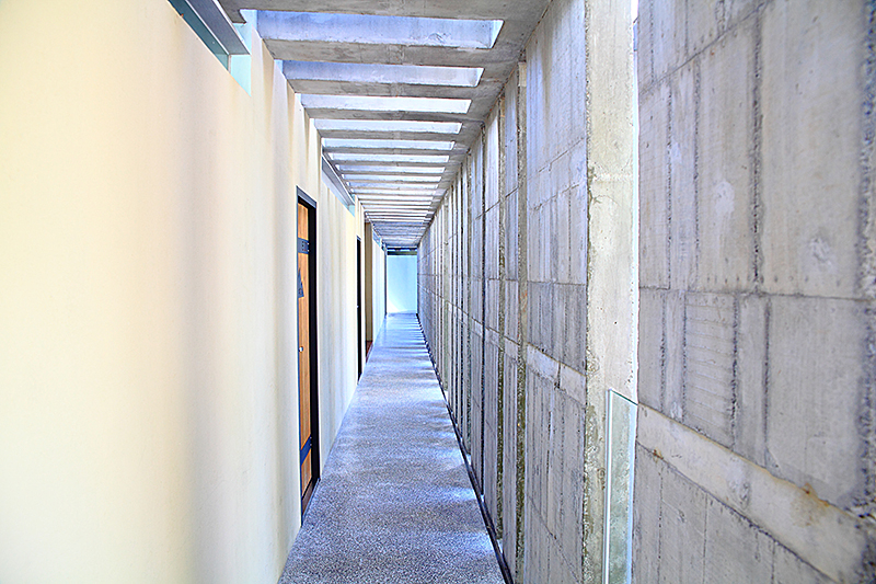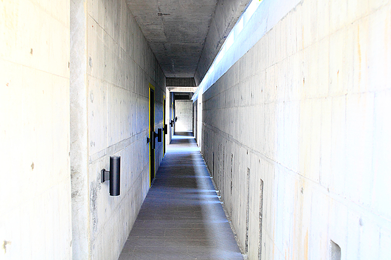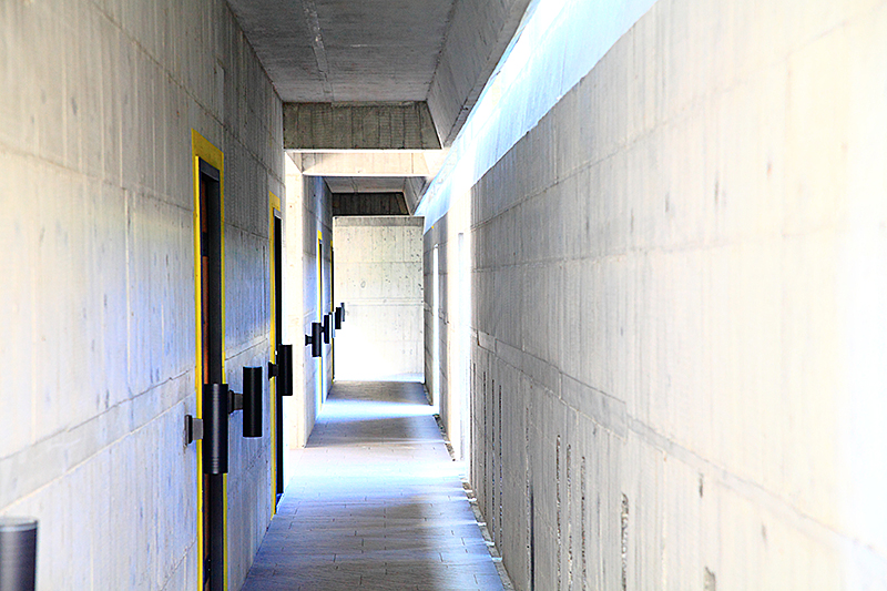 圓弧設計曲線,與直線垂直,間接矗立,帶有現代感,清水模牆面與天花板,很樸實,沒有華麗的色彩,卻能呈現建築本身質感。